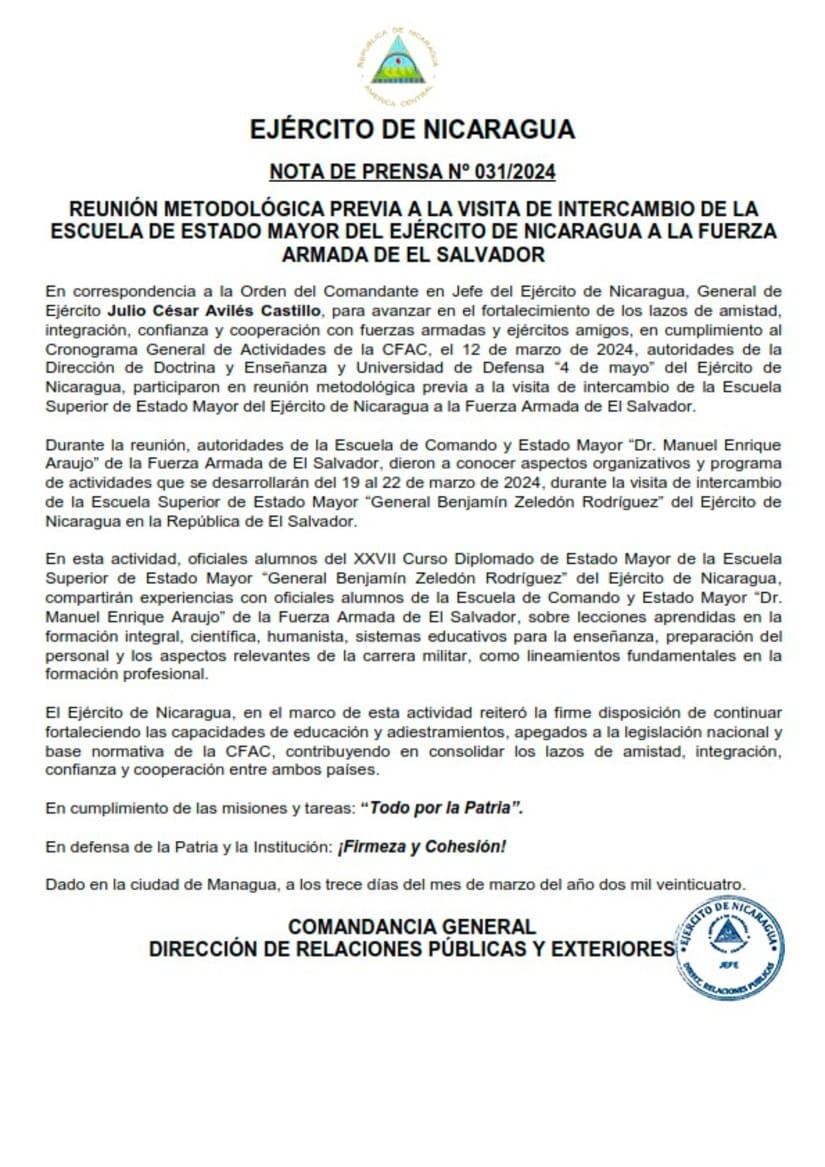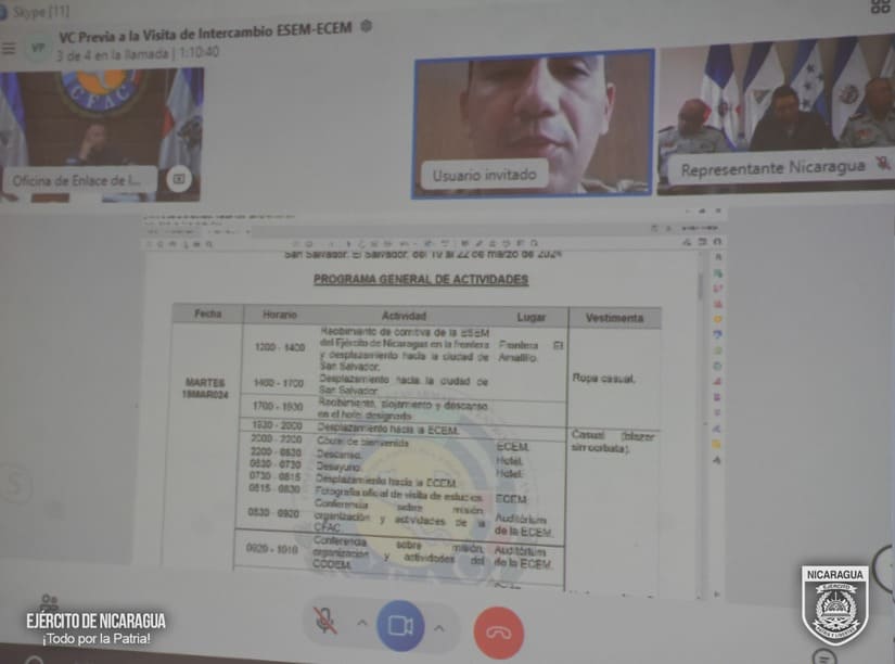 En correspondencia a la Orden del Comandante en Jefe del Ejército de Nicaragua, General de Ejército Julio César Avilés Castillo, para avanzar en el fortalecimiento de los lazos de amistad, integración, confianza y cooperación con fuerzas armadas y ejércitos amigos, en cumplimiento al Cronograma General de Actividades de la CFAC, el 12 de marzo de 2024, autoridades de la Dirección de Doctrina y Enseñanza y Universidad de Defensa “4 de mayo” del Ejército de Nicaragua, participaron en reunión metodológica previa a la visita de intercambio de la Escuela Superior de Estado Mayor del Ejército de Nicaragua a la Fuerza Armada de El Salvador.
