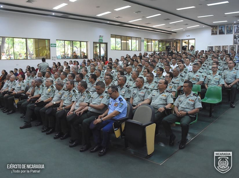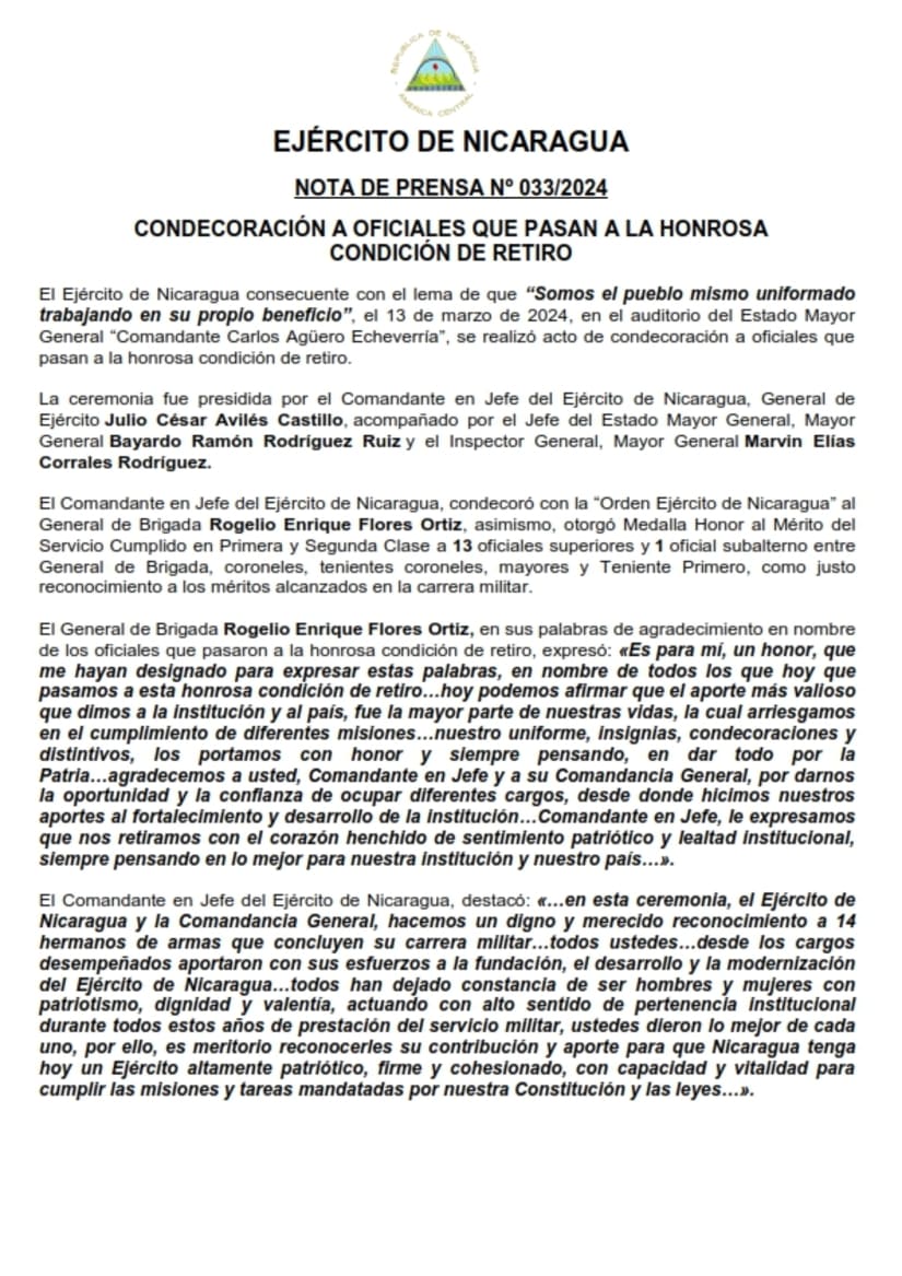 El Ejército de Nicaragua consecuente con el lema de que “Somos el pueblo mismo uniformado trabajando en su propio beneficio”, el 13 de marzo de 2024, en el auditorio del Estado Mayor General “Comandante Carlos Agüero Echeverría”, se realizó acto de condecoración a oficiales que pasan a la honrosa condición de retiro.