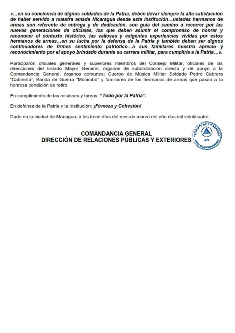 «…en su conciencia de dignos soldados de la Patria, deben llevar siempre la alta satisfacción de haber servido a nuestra amada Nicaragua desde esta institución…ustedes hermanos de armas son referente de entrega y de dedicación, son guía del camino a recorrer por las nuevas generaciones de oficiales, los que deben asumir el compromiso de honrar y reconocer el contexto histórico, las valiosas y exigentes experiencias vividas por estos hermanos de armas…en su lucha por la defensa de la Patria y también deben ser dignos continuadores de firmes sentimiento patriótico…a sus familiares nuestro aprecio y reconocimiento por el apoyo brindado durante su carrera militar, para cumplirle a la Patria…».