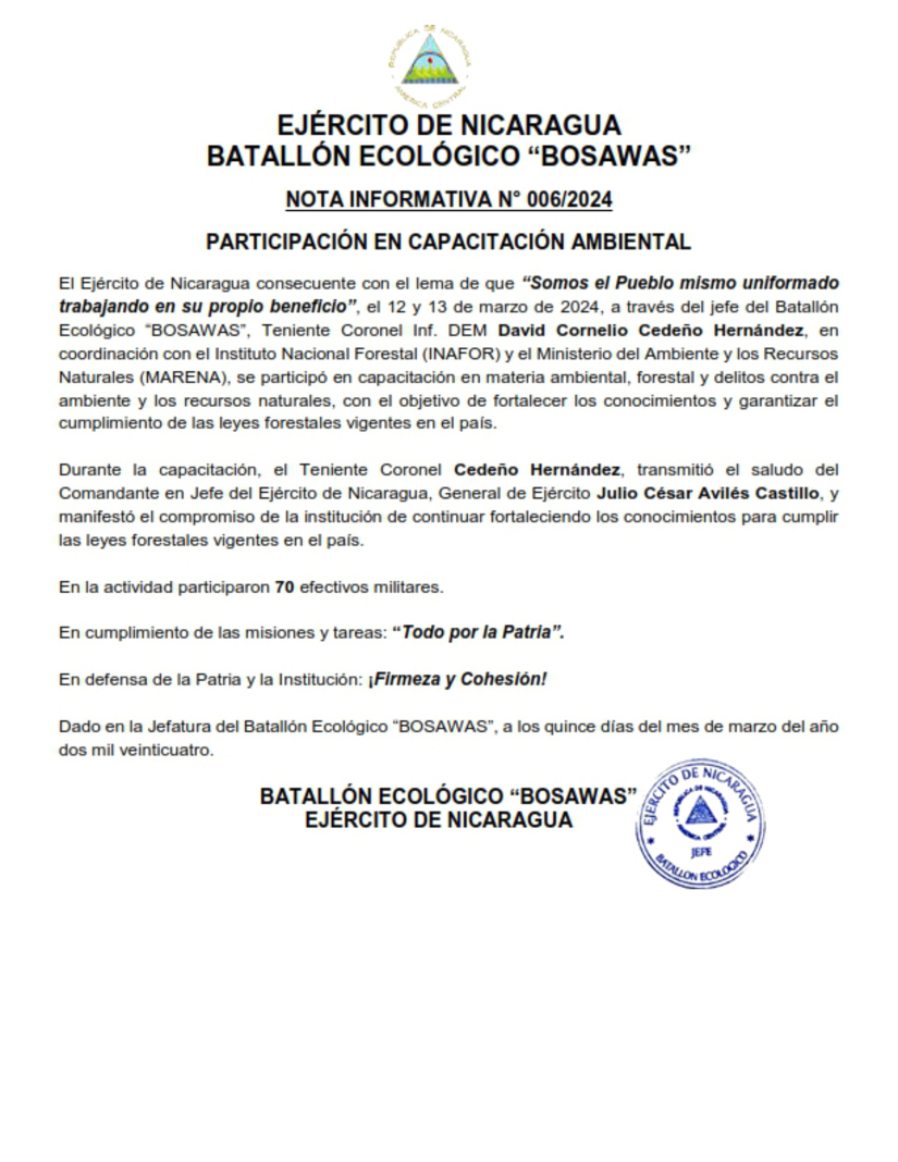 El Ejército de Nicaragua consecuente con el lema de que “Somos el Pueblo mismo uniformado trabajando en su propio beneficio”, el 12 y 13 de marzo de 2024, a través del jefe del Batallón Ecológico “BOSAWAS”, Teniente Coronel Inf. DEM David Cornelio Cedeño Hernández, en coordinación con el Instituto Nacional Forestal (INAFOR) y el Ministerio del Ambiente y los Recursos Naturales (MARENA), se participó en capacitación en materia ambiental, forestal y delitos contra el ambiente y los recursos naturales, con el objetivo de fortalecer los conocimientos y garantizar el cumplimiento de las leyes forestales vigentes en el país.