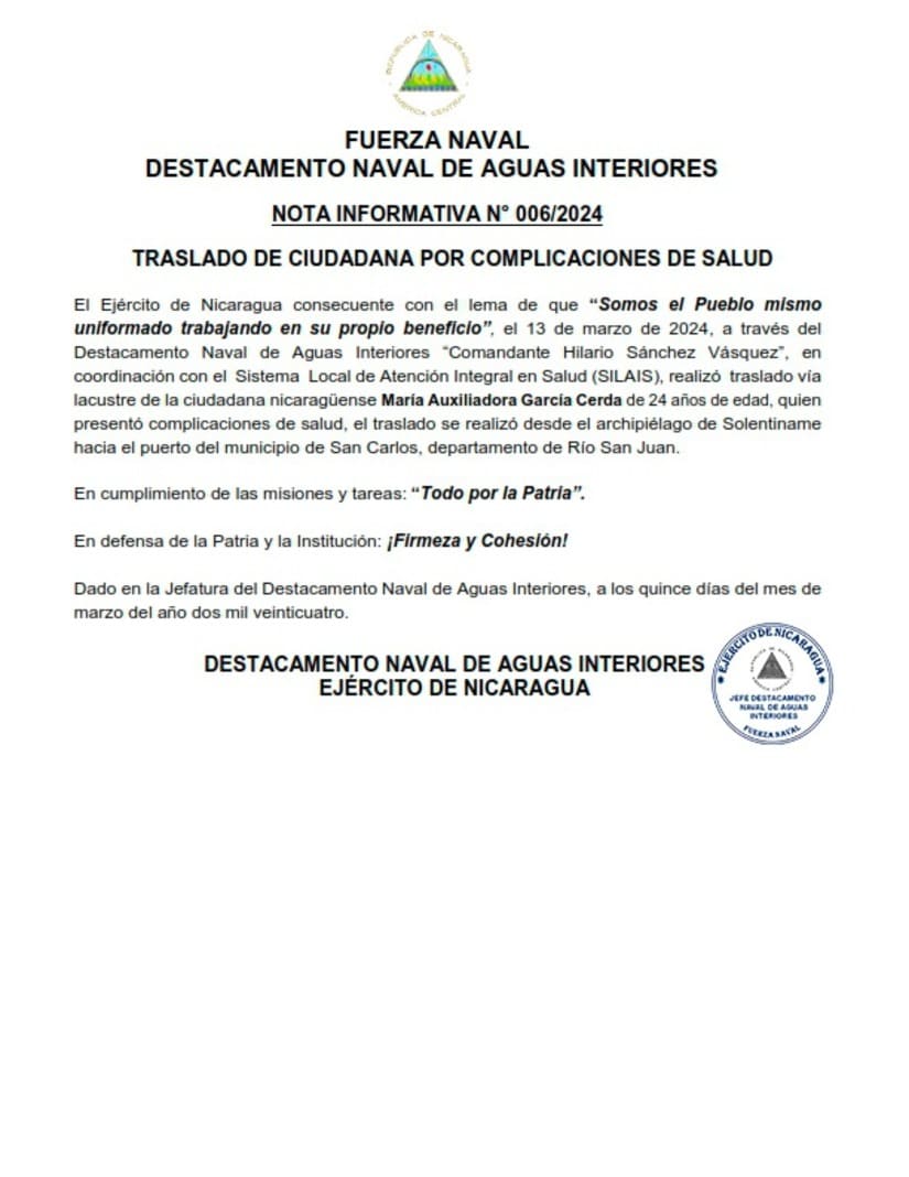 El Ejército de Nicaragua consecuente con el lema de que “Somos el Pueblo mismo uniformado trabajando en su propio beneficio”, el 13 de marzo de 2024, a través del Destacamento Naval de Aguas Interiores “Comandante Hilario Sánchez Vásquez”, en coordinación con el Sistema Local de Atención Integral en Salud (SILAIS), realizó traslado vía lacustre de la ciudadana nicaragüense María Auxiliadora García Cerda de 24 años de edad, quien presentó complicaciones de salud, el traslado se realizó desde el archipiélago de Solentiname hacia el puerto del municipio de San Carlos, departamento de Río San Juan.