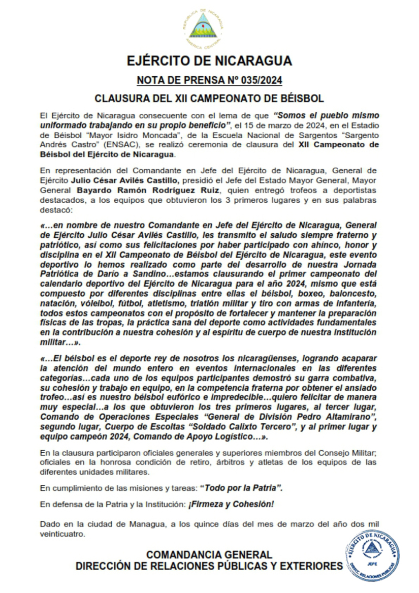 «…en nombre de nuestro Comandante en Jefe del Ejército de Nicaragua, General de Ejército Julio César Avilés Castillo, les transmito el saludo siempre fraterno y patriótico, así como sus felicitaciones por haber participado con ahínco, honor y disciplina en el XII Campeonato de Béisbol del Ejército de Nicaragua, este evento deportivo lo hemos realizado como parte del desarrollo de nuestra Jornada Patriótica de Darío a Sandino… estamos clausurando el primer campeonato del calendario deportivo del Ejército de Nicaragua para el año 2024, mismo que está compuesto por diferentes disciplinas entre ellas el béisbol, boxeo, baloncesto, natación, vóleibol, fútbol, atletismo, triatlón militar y tiro con armas de infantería, todos estos campeonatos con el propósito de fortalecer y mantener la preparación físicas de las tropas, la práctica sana del deporte como actividades fundamentales en la contribución a nuestra cohesión y al espíritu de cuerpo de nuestra institución militar…».