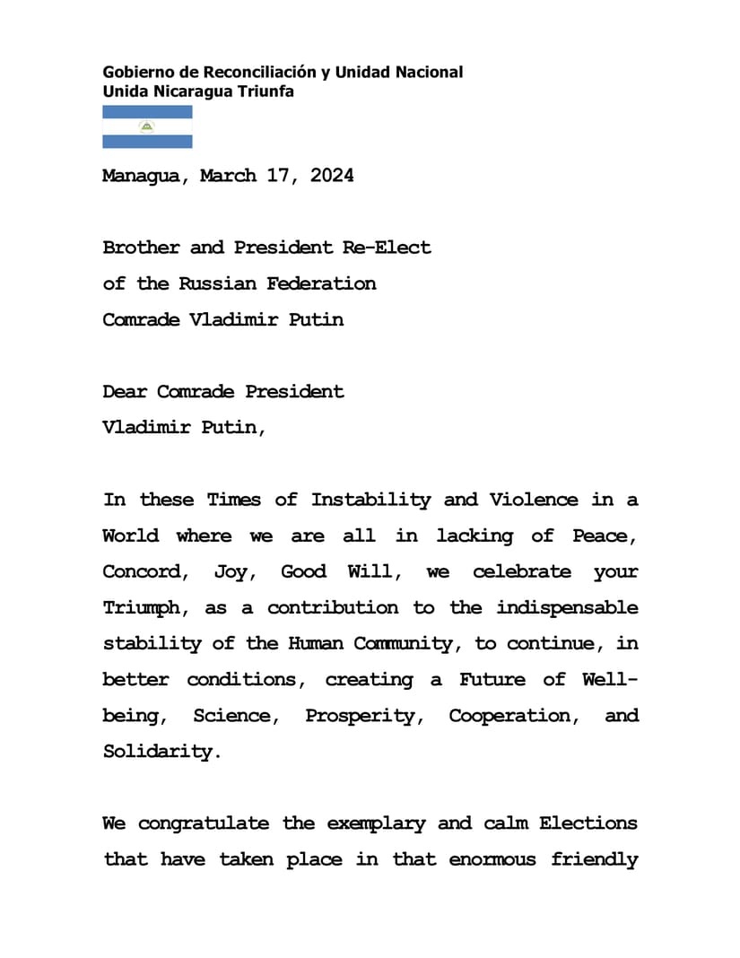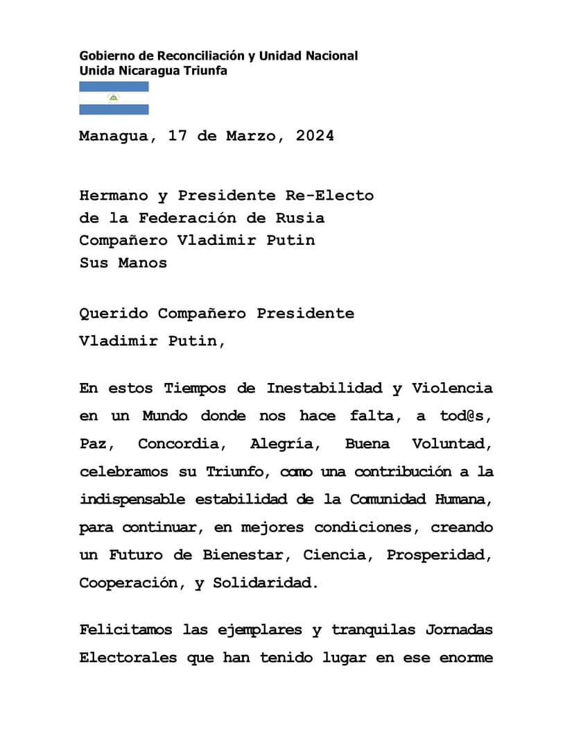 Mensaje del Presidente Comandante Daniel Ortega y la Vicepresidenta Compañera Rosario Murillo, al Compañero Vladimir Putin, Presidente de la Federación de Rusia, por su Triunfo en las Elecciones Presidenciales, realizadas hoy en ese hermano país.