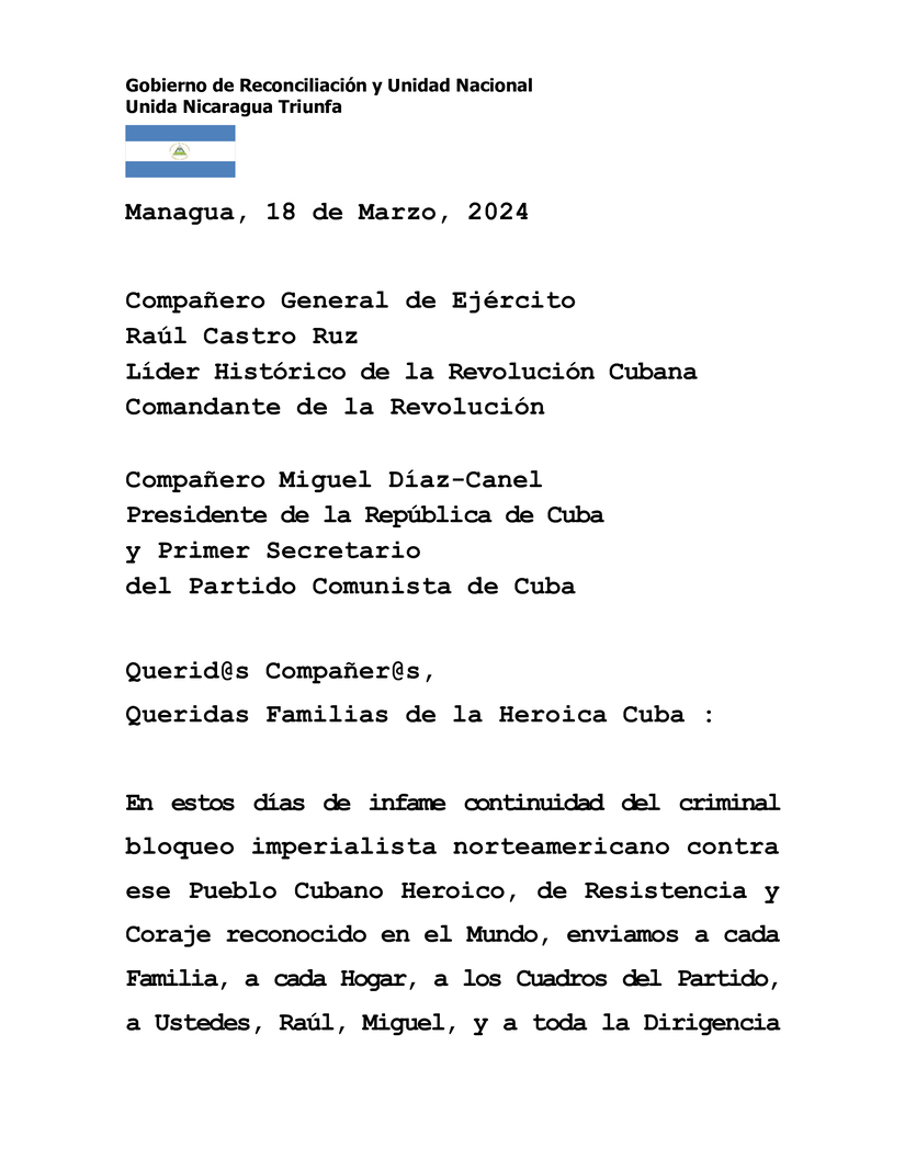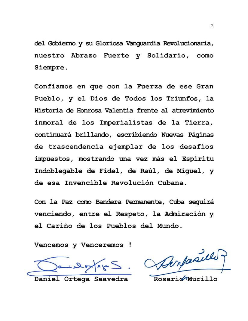Mensaje de Solidaridad del Presidente-Comandante Daniel, y de la Vicepresidenta Rosario Murillo, al Compañero General de Ejército Raúl Castro Ruz, Líder Histórico de la Revolución Cubana, Comandante de la Revolución; al Compañero Miguel Díaz-Canel, Presidente de Cuba y Primer Secretario del Partido Comunista de Cuba, y al Querido Pueblo Cubano, ante la infame continuidad del bloqueo imperialista norteamericano contra ese Hermano País.Compañero General de Ejército