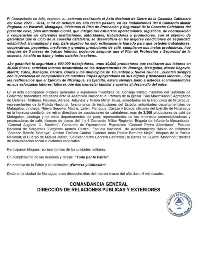 «Se garantizó la seguridad a 600,000 trabajadores, unos 40,000 productores que realizaron sus labores en 50,000 fincas, actividad intensa desarrollada en los departamentos de Jinotega, Matagalpa, Nueva Segovia, Madriz, Estelí, Managua, Carazo, Boaco y los municipios de Ticuantepe y Nueva Guinea…cuenten siempre con la presencia de componentes de nuestras tropas apoyándoles en sus dignas y dedicadas labores….hoy les reafirmamos que el Ejército de Nicaragua, su Ejército, estará siempre junto a ustedes acompañándoles en sus esforzadas labores; labores que dan bienestar familiar y aportes al desarrollo del país»