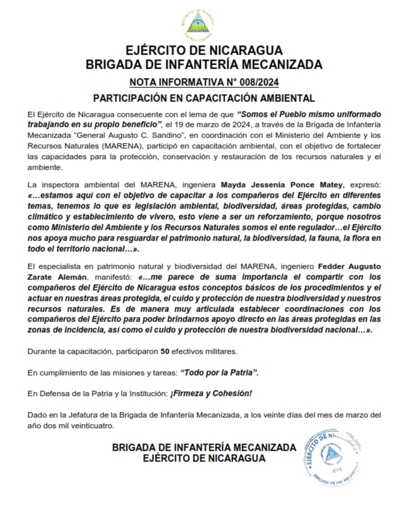 El Ejército de Nicaragua consecuente con el lema de que “Somos el Pueblo mismo uniformado trabajando en su propio beneficio”, el 19 de marzo de 2024, a través de la Brigada de Infantería Mecanizada “General Augusto C. Sandino”, en coordinación con el Ministerio del Ambiente y los Recursos Naturales (MARENA), participó en capacitación ambiental, con el objetivo de fortalecer las capacidades para la protección, conservación y restauración de los recursos naturales y el ambiente.