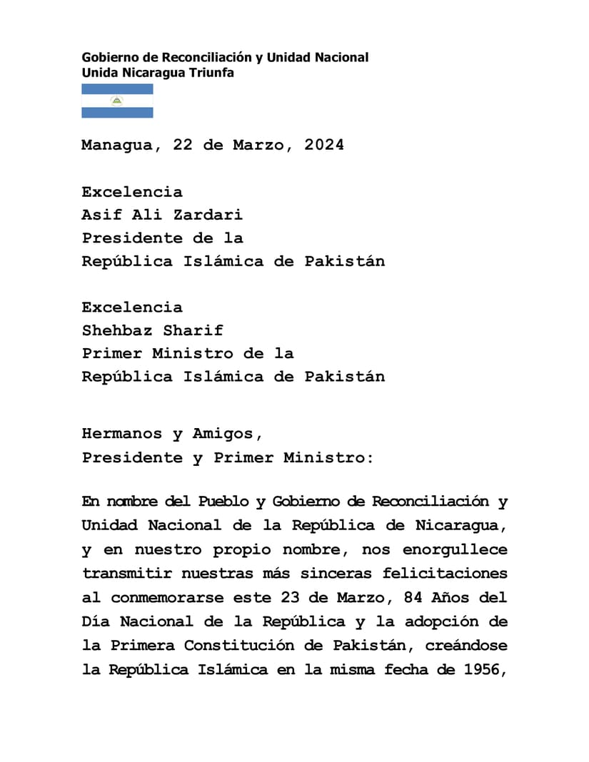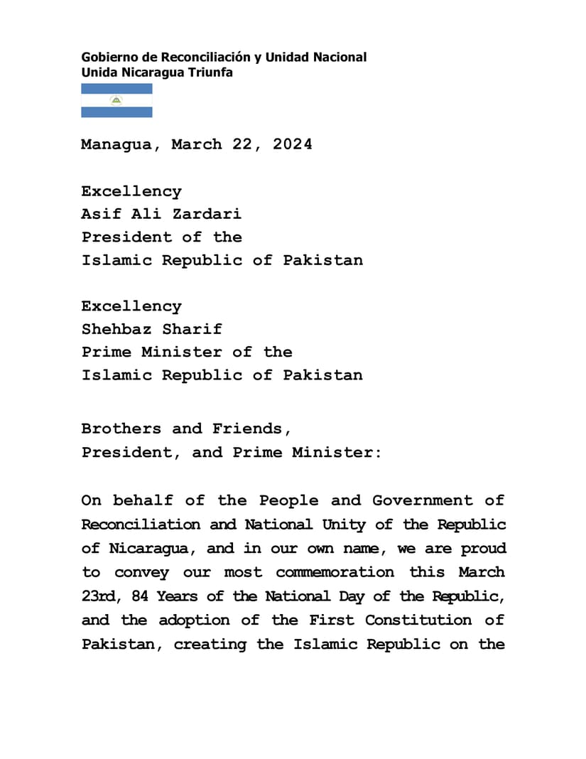 En nombre del Pueblo y Gobierno de Reconciliación y Unidad Nacional de la República de Nicaragua, y en nuestro propio nombre, nos enorgullece transmitir nuestras más sinceras felicitaciones al conmemorarse este 23 de Marzo, 84 Años del Día Nacional de la República y la adopción de la Primera Constitución de Pakistán, creándose la República Islámica en la misma fecha de 1956, saludos respetuosos desde nuestra Nicaragua Bendita y Por Siempre Libre.