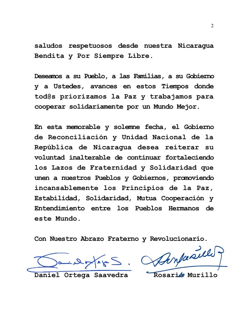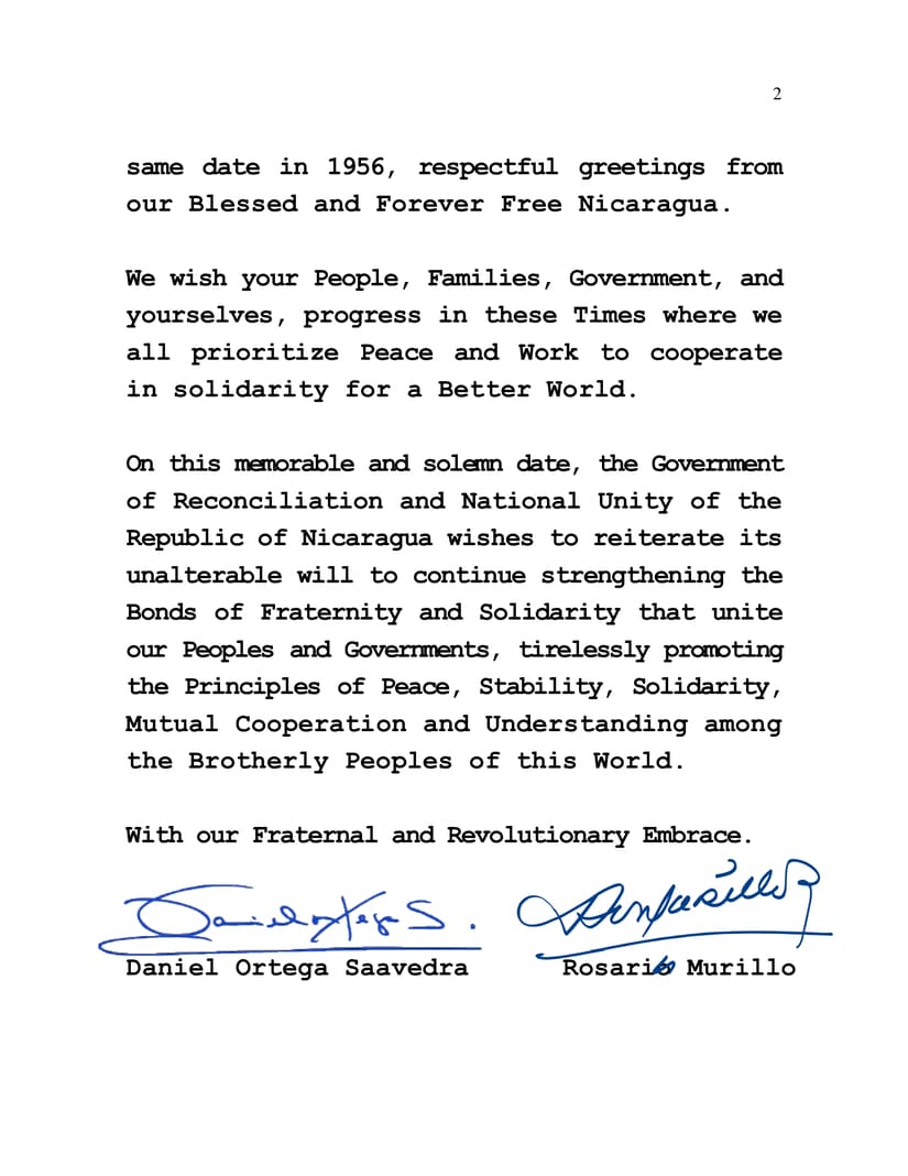 En esta memorable y solemne fecha, el Gobierno de Reconciliación y Unidad Nacional de la República de Nicaragua desea reiterar su voluntad inalterable de continuar fortaleciendo los Lazos de Fraternidad y Solidaridad que unen a nuestros Pueblos y Gobiernos, promoviendo incansablemente los Principios de la Paz, Estabilidad, Solidaridad, Mutua Cooperación y Entendimiento entre los Pueblos Hermanos de este Mundo.