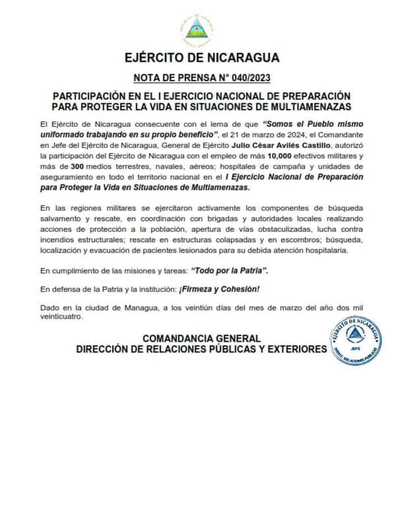 El Ejército de Nicaragua consecuente con el lema de que “Somos el Pueblo mismo uniformado trabajando en su propio beneficio”, el 21 de marzo de 2024, el Comandante en Jefe del Ejército de Nicaragua, General de Ejército Julio César Avilés Castillo, autorizó la participación del Ejército de Nicaragua con el empleo de más 10,000 efectivos militares y más de 300 medios terrestres, navales, aéreos; hospitales de campaña y unidades de aseguramiento en todo el territorio nacional en el I Ejercicio Nacional de Preparación para Proteger la Vida en Situaciones de Multiamenazas.