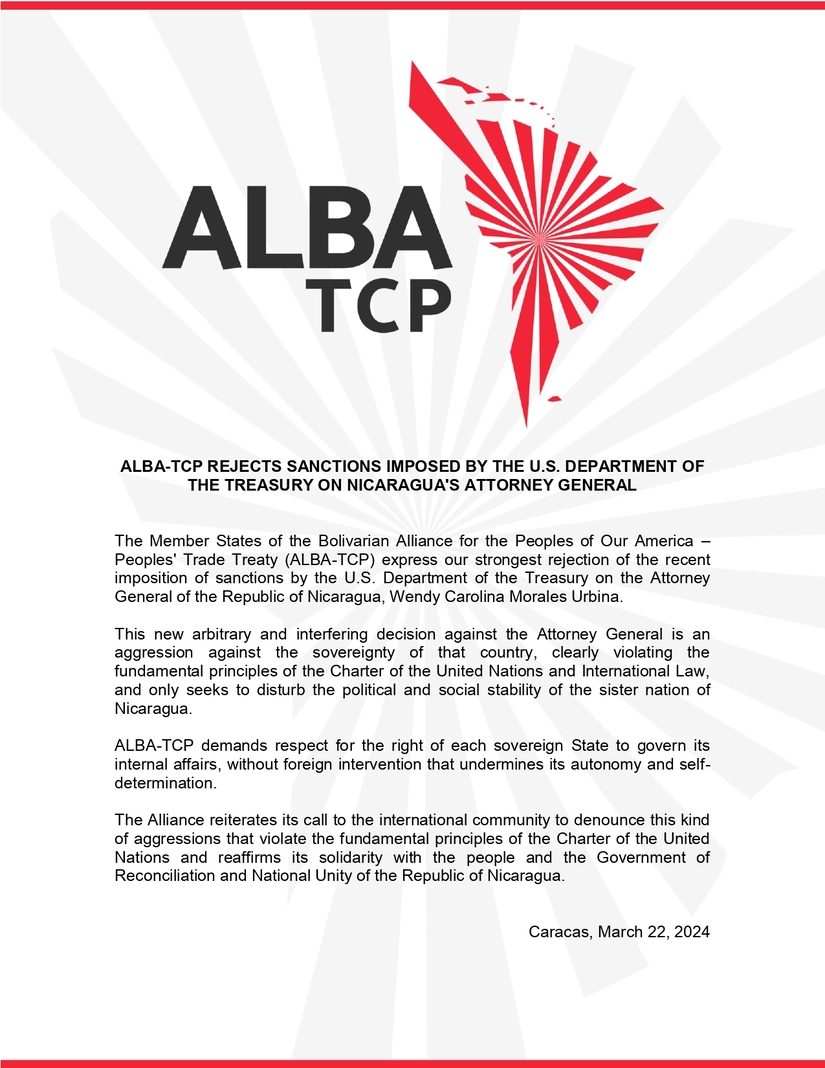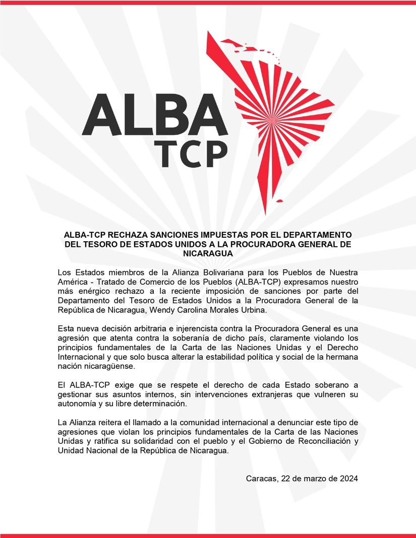 Los Estados miembros de la Alianza Bolivariana para los Pueblos de Nuestra América - Tratado de Comercio de los Pueblos (ALBA-TCP) expresamos nuestro más enérgico rechazo a la reciente imposición de sanciones por parte del Departamento del Tesoro de Estados Unidos a la Procuradora General de la República de Nicaragua, Wendy Carolina Morales Urbina.