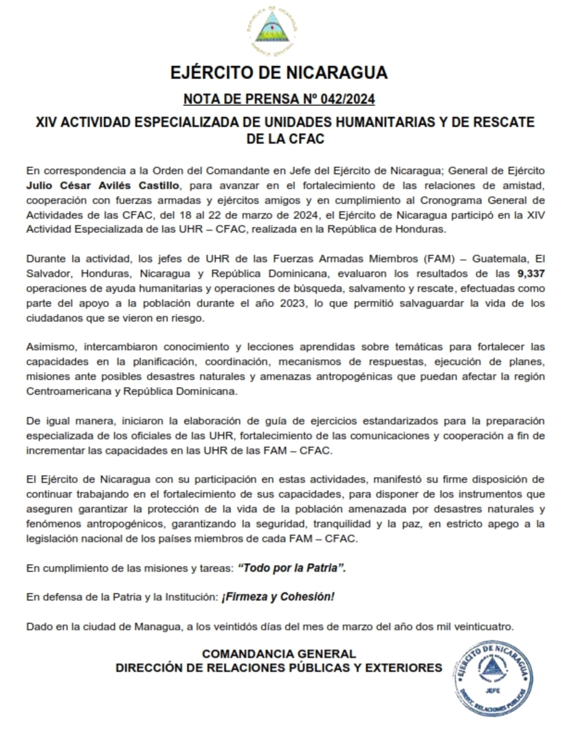 En correspondencia a la Orden del Comandante en Jefe del Ejército de Nicaragua; General de Ejército Julio César Avilés Castillo, para avanzar en el fortalecimiento de las relaciones de amistad, cooperación con fuerzas armadas y ejércitos amigos y en cumplimiento al Cronograma General de Actividades de las CFAC, del 18 al 22 de marzo de 2024, el Ejército de Nicaragua participó en la XIV Actividad Especializada de las UHR – CFAC, realizada en la República de Honduras.