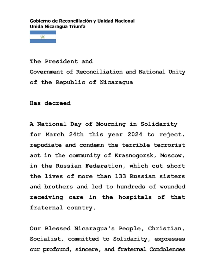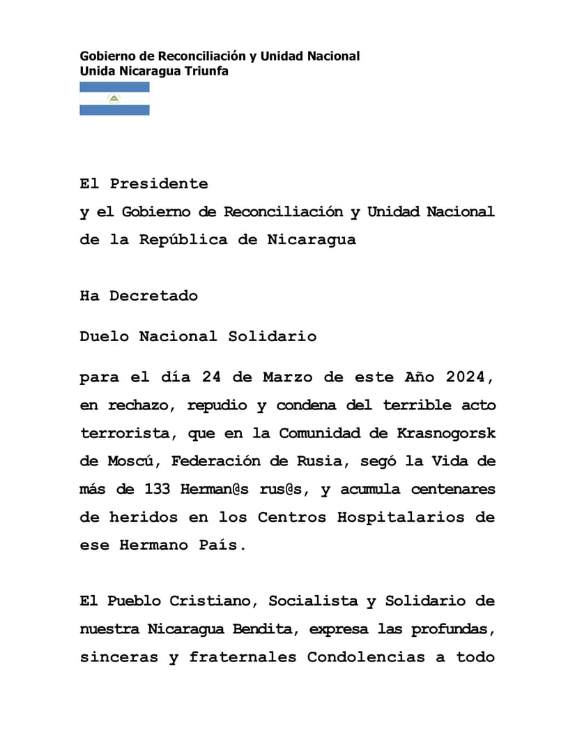 Our Blessed Nicaragua's People, Christian, Socialist, committed to Solidarity, expresses our profound, sincere, and fraternal Condolences to all that valient People, to their President Vladimir Putin and, consequently, tomorrow Sunday March 24th, will carry out Events of Solidarity and Union in all the municipalities of our Nicaragua, Blessed, Sovereingn, Forever Free.