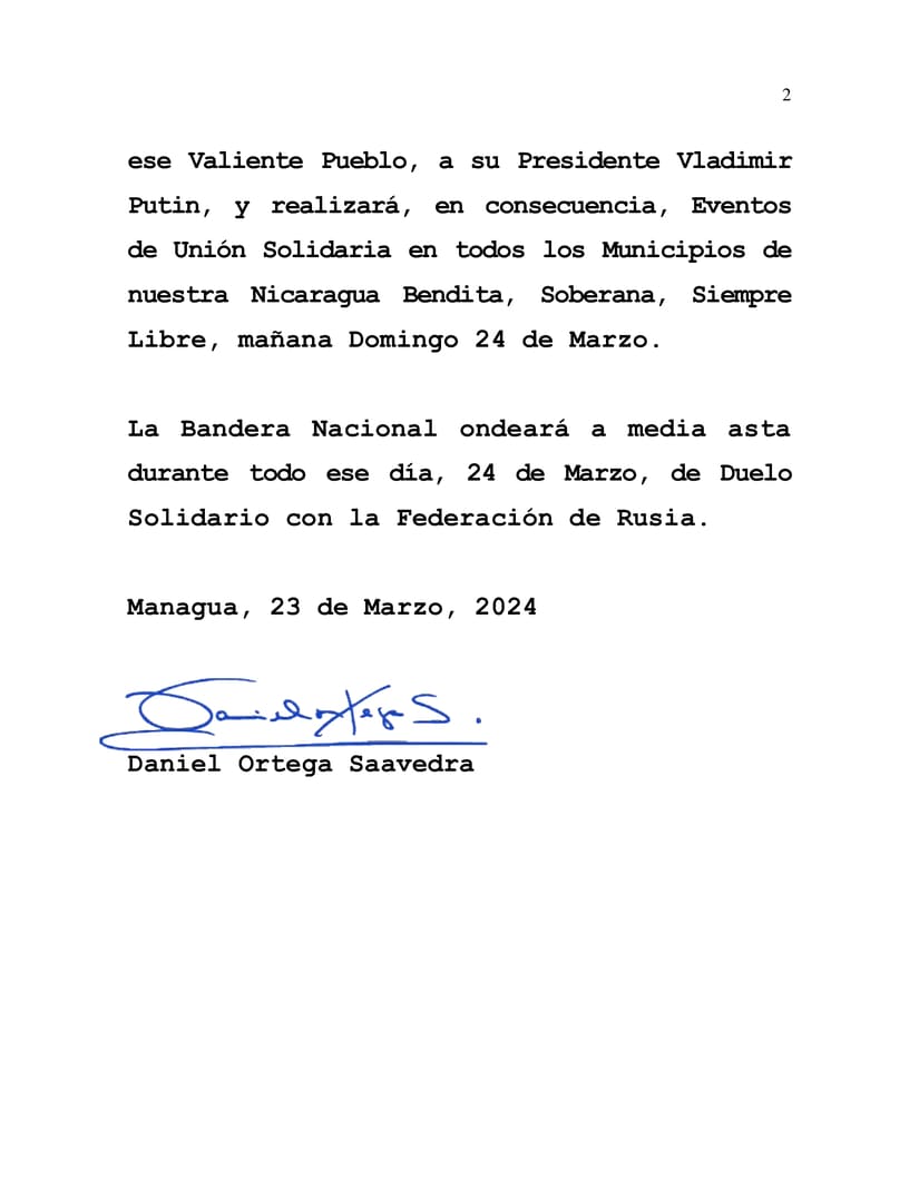 El Pueblo Cristiano, Socialista y Solidario de nuestra Nicaragua Bendita, expresa las profundas, sinceras y fraternales Condolencias a todo ese Valiente Pueblo, a su Presidente Vladimir Putin, y realizará, en consecuencia, Eventos de Unión Solidaria en todos los Municipios de nuestra Nicaragua Bendita, Soberana, Siempre Libre, mañana Domingo 24 de Marzo.
