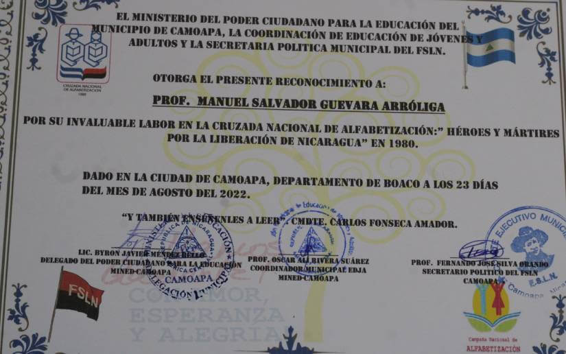 No muy lejos de Tierra Azul se encuentra Camoapa, siempre en el departamento de Boaco. Ahí habita Manuel Salvador Guevara, quien fue parte de la Cruzada Nacional de Alfabetización enseñando de una manera diferente. Llevó el conocimiento a través de la música, canto, poesía y teatro.
