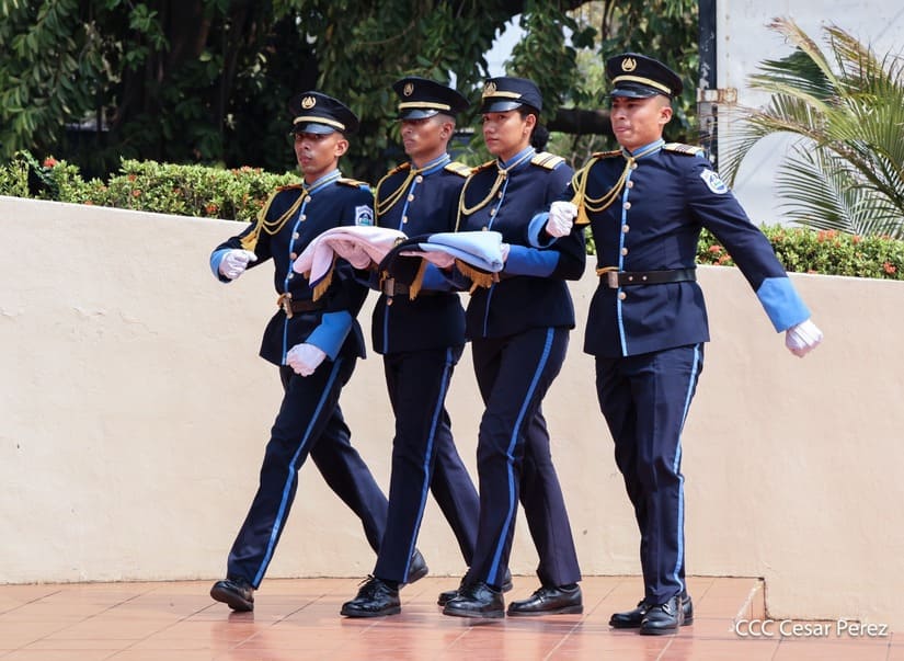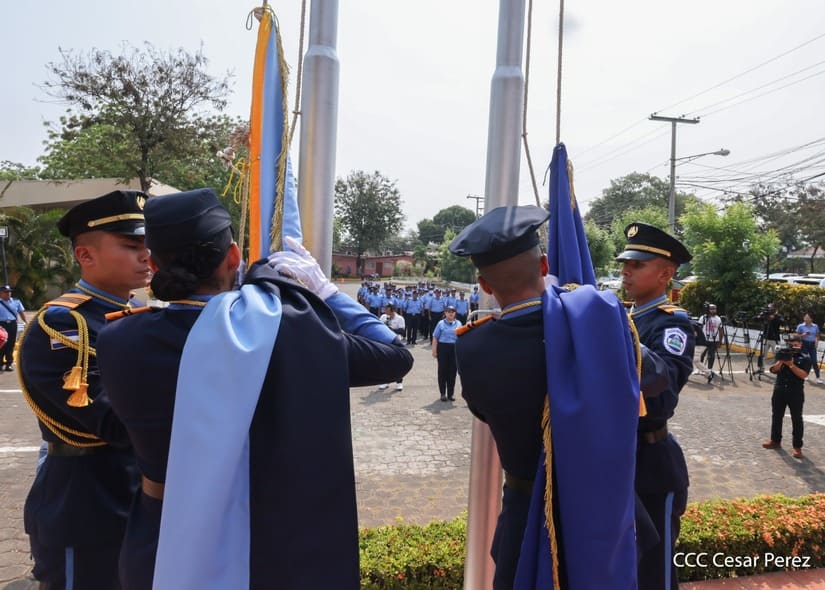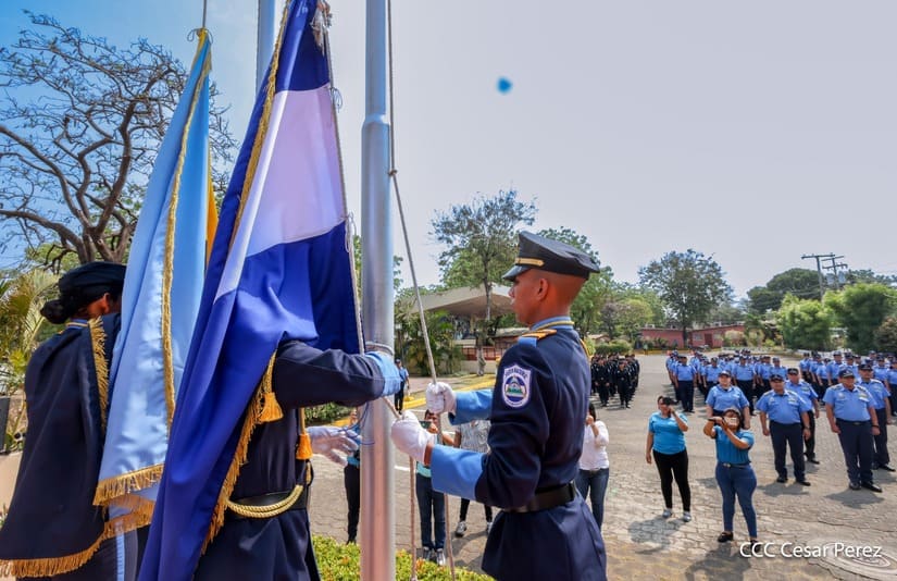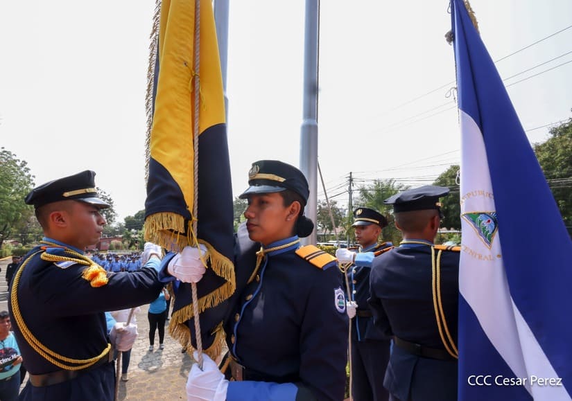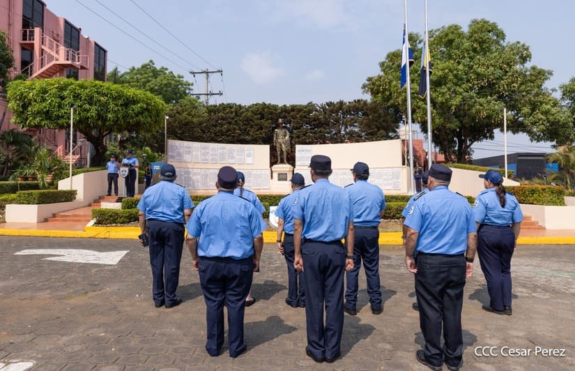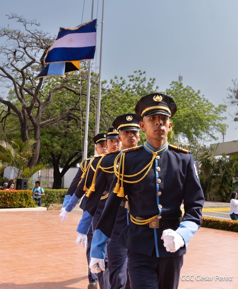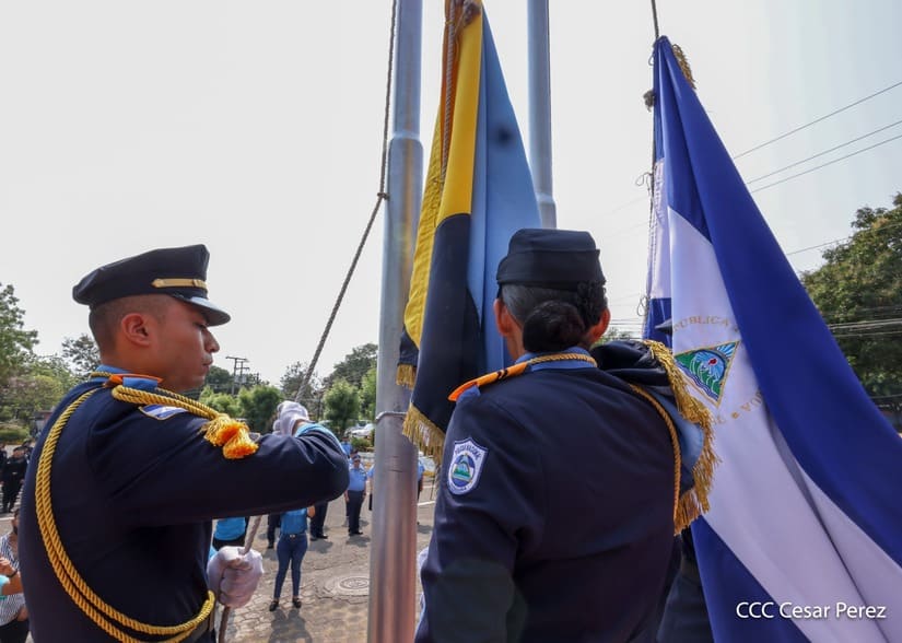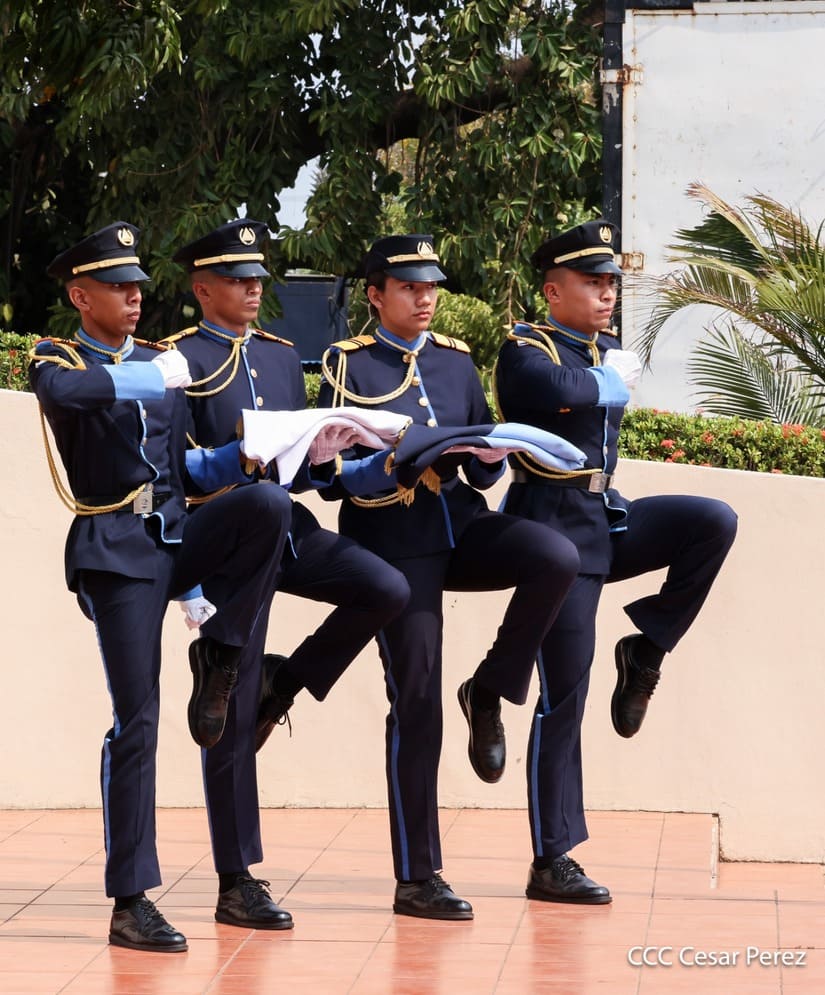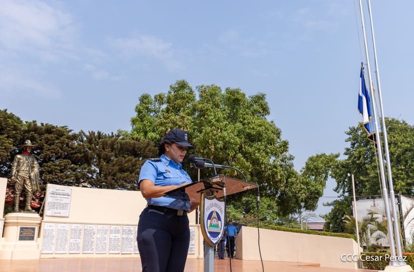 Frente al Monumento del General de Hombres y Mujeres Libres Augusto C. Sandino fue izado el Pabellón Nacional y la bandera de la Policía a media asta y se dio lectura al Decreto que dicta este 24 de marzo como día de Duelo Nacional Solidario.