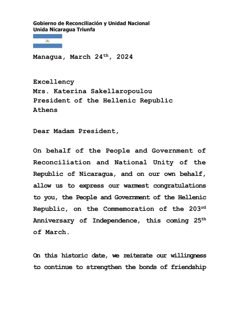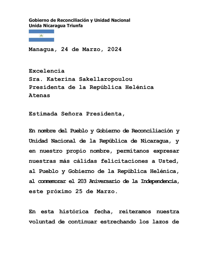 En nombre del Pueblo y Gobierno de Reconciliación y Unidad Nacional de la República de Nicaragua, y en nuestro propio nombre, permítanos expresar nuestras más cálidas felicitaciones a Usted, al Pueblo y Gobierno de la República Helénica, al conmemorar el 203 Aniversario de la Independencia, este próximo 25 de marzo.