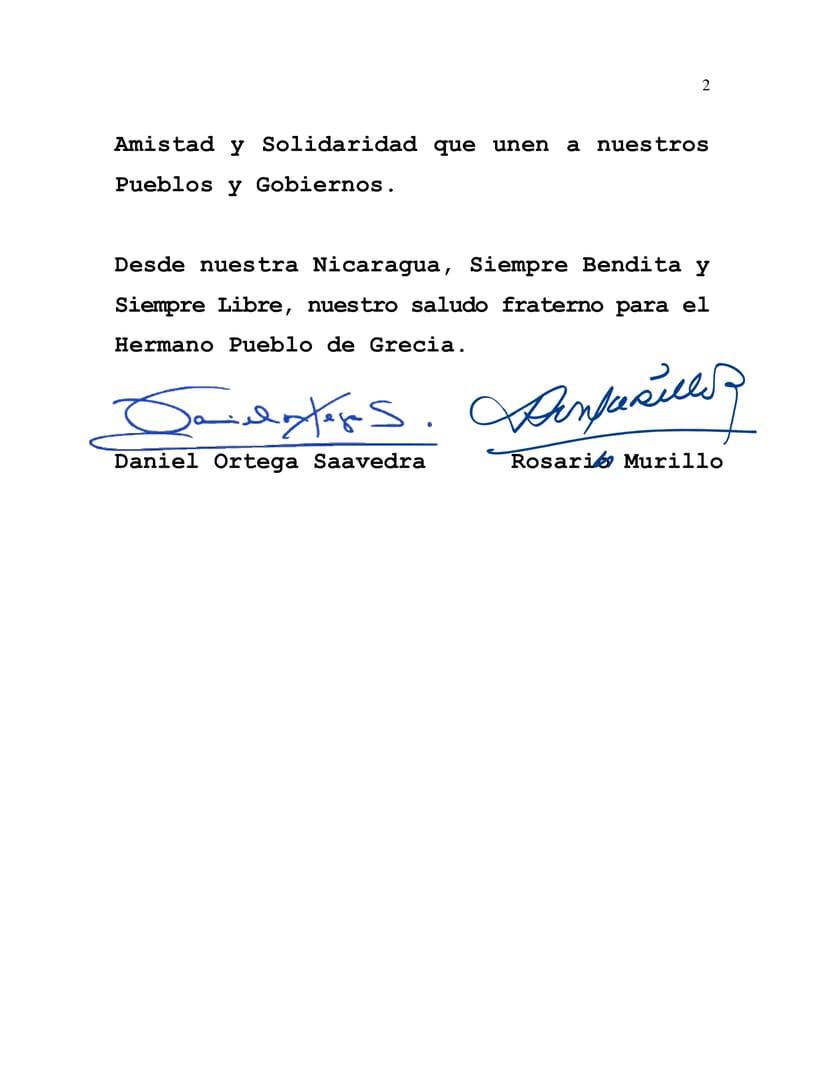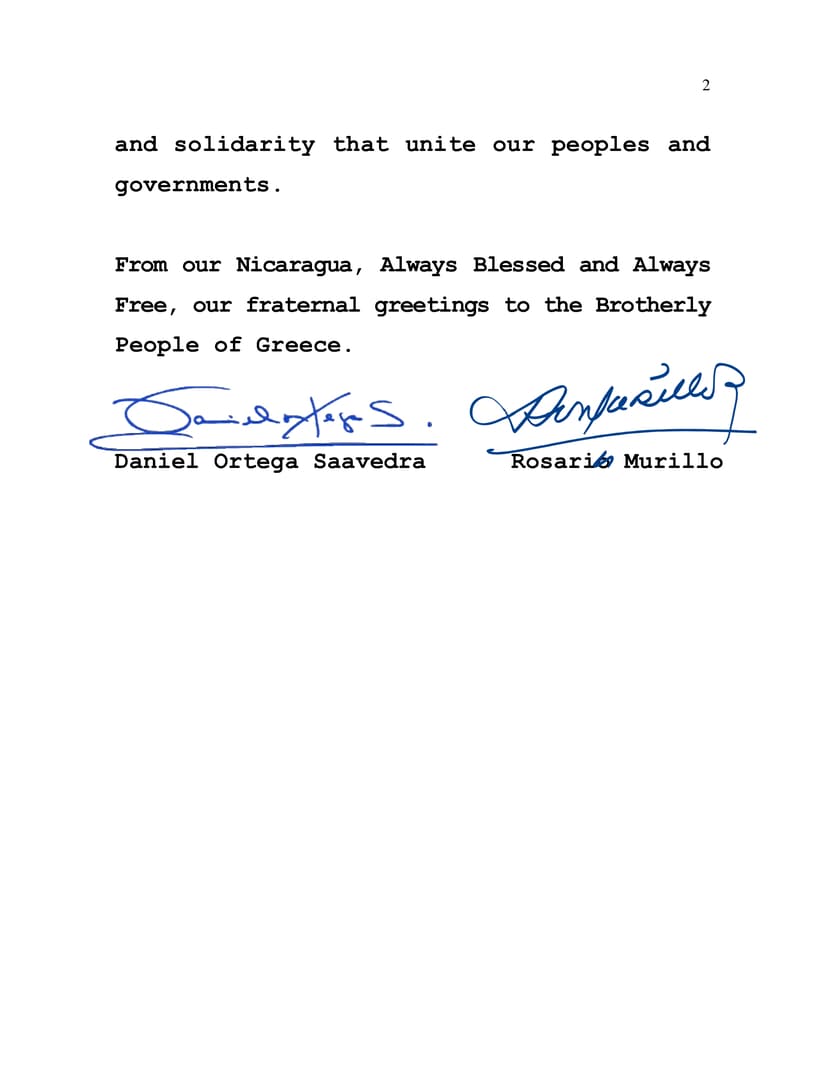 Desde nuestra Nicaragua, Siempre Bendita y Siempre Libre, nuestro saludo fraterno para el Hermano Pueblo de Grecia.