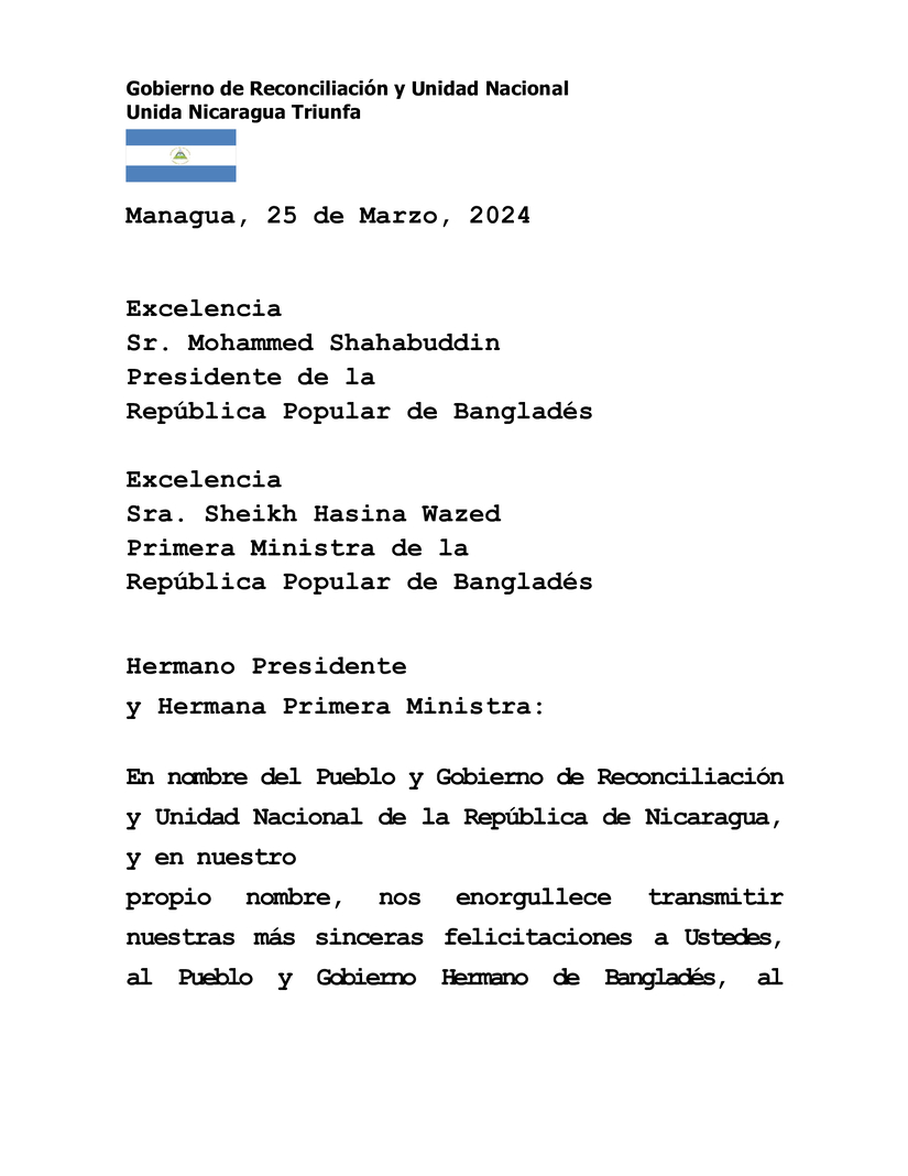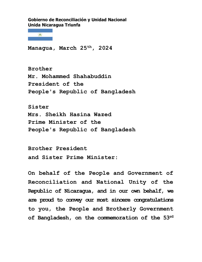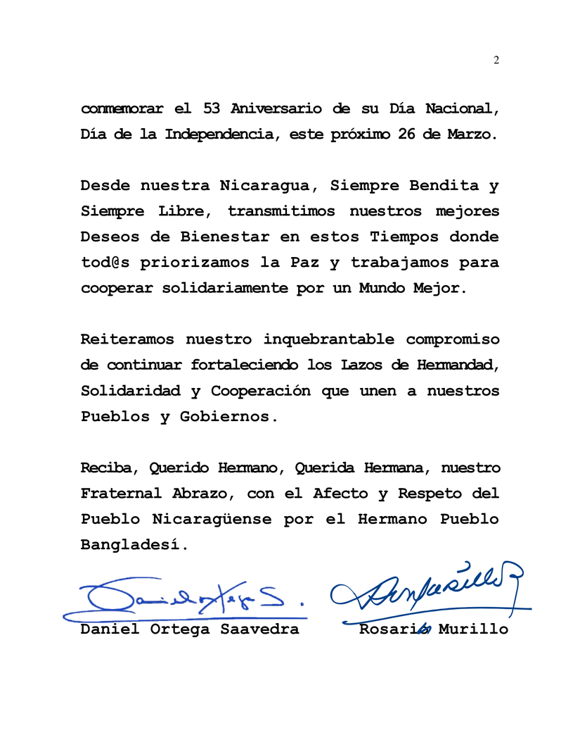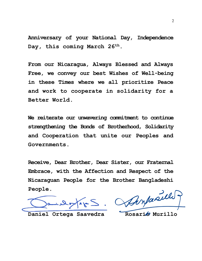 En nombre del Pueblo y Gobierno de Reconciliación y Unidad Nacional de la República de Nicaragua, y en nuestro propio nombre, nos enorgullece transmitir nuestras más sinceras felicitaciones a Ustedes, al Pueblo y Gobierno Hermano de Bangladés, al conmemorar el 53 Aniversario de su Día Nacional, Día de la Independencia, este próximo 26 de Marzo.