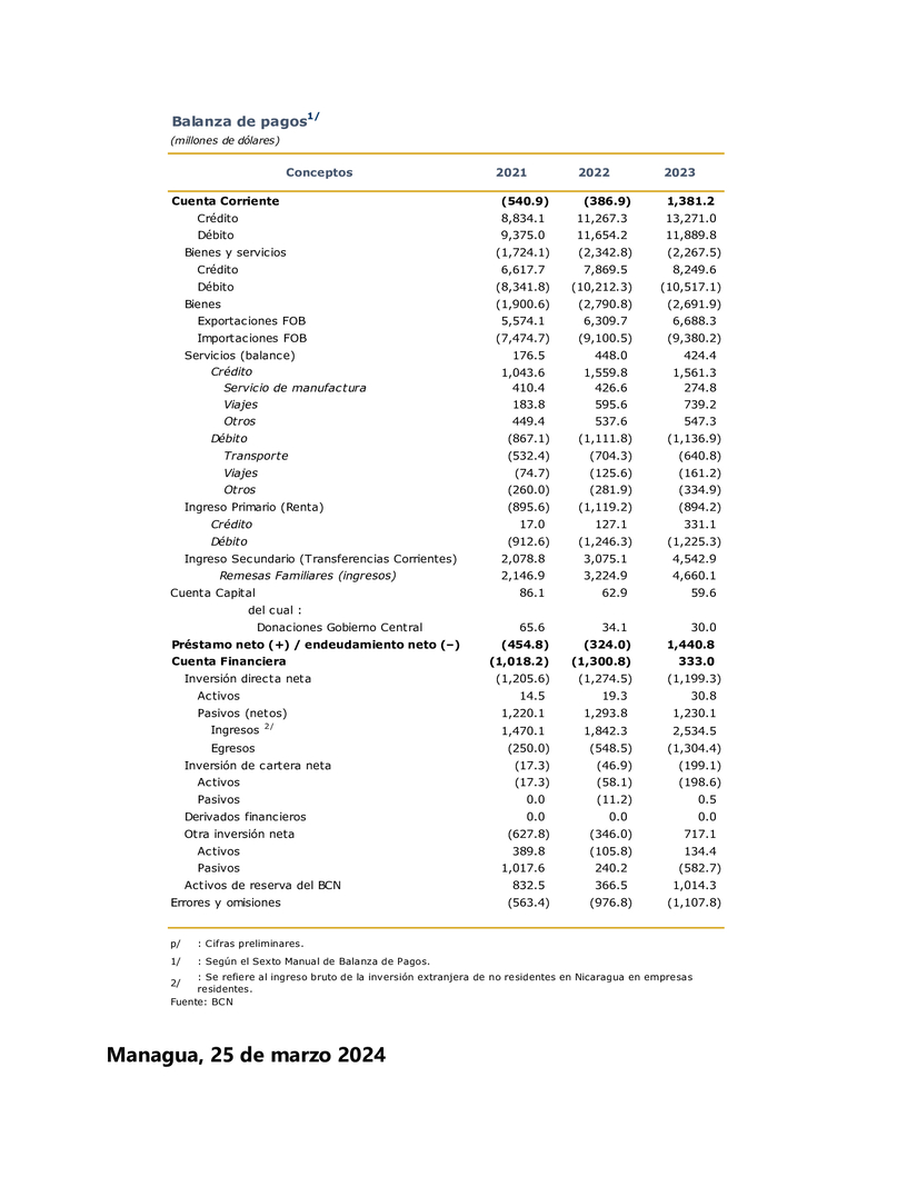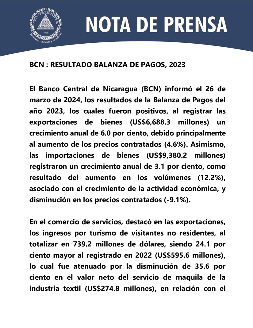 El Banco Central de Nicaragua (BCN) informó el 26 de marzo de 2024, los resultados de la Balanza de Pagos del año 2023, los cuales fueron positivos, al registrar las exportaciones de bienes (US$6,688.3 millones) un crecimiento anual de 6.0 por ciento, debido principalmente al aumento de los precios contratados (4.6%). Asimismo, las importaciones de bienes (US$9,380.2 millones) registraron un crecimiento anual de 3.1 por ciento, como resultado del aumento en los volúmenes (12.2%), asociado con el crecimiento de la actividad económica, y disminución en los precios contratados (-9.1%).