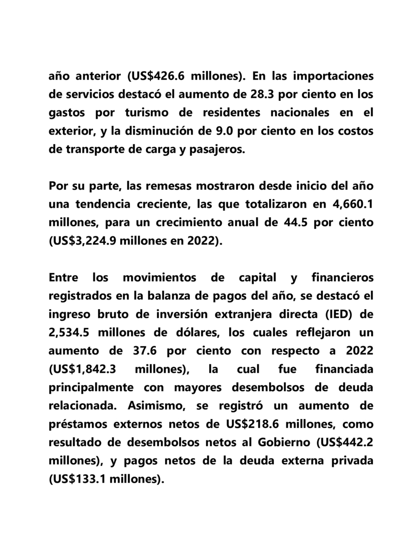 Entre los movimientos de capital y financieros registrados en la balanza de pagos del año, se destacó el ingreso bruto de inversión extranjera directa (IED) de 2,534.5 millones de dólares, los cuales reflejaron un aumento de 37.6 por ciento con respecto a 2022 (US$1,842.3 millones), la cual fue financiada principalmente con mayores desembolsos de deuda relacionada. Asimismo, se registró un aumento de préstamos externos netos de US$218.6 millones, como resultado de desembolsos netos al Gobierno (US$442.2 millones), y pagos netos de la deuda externa privada (US$133.1 millones).