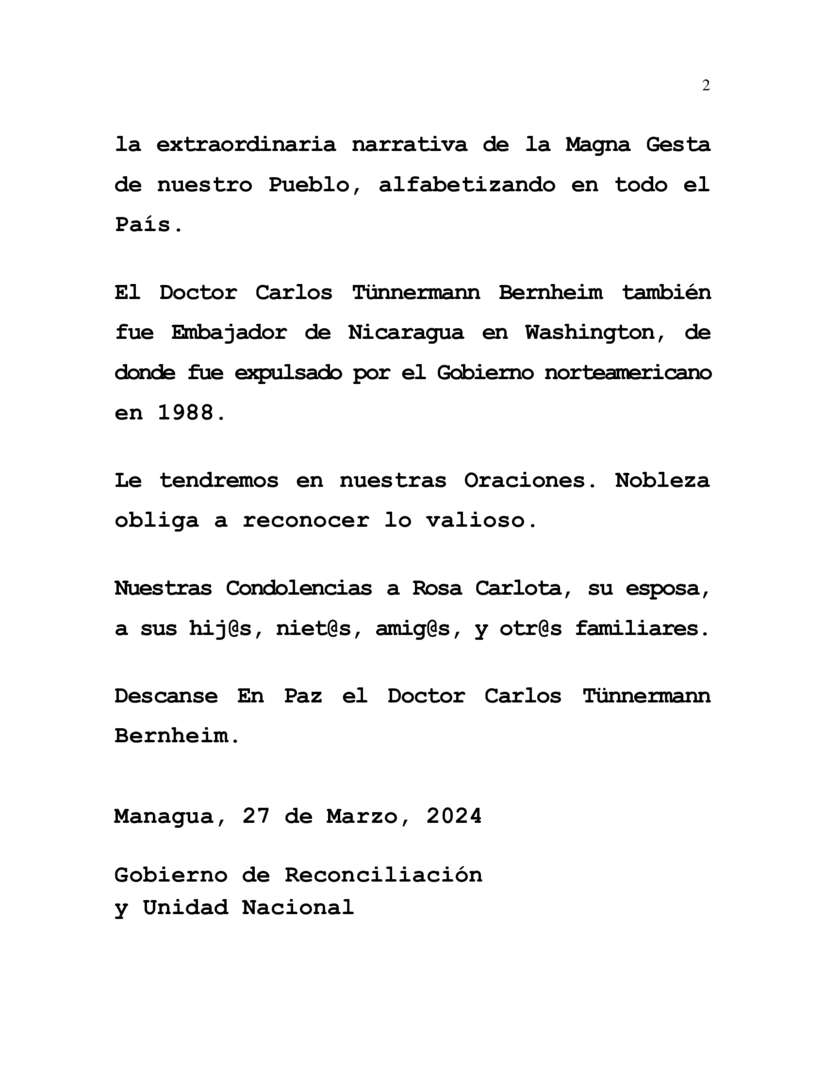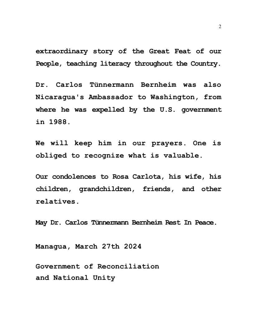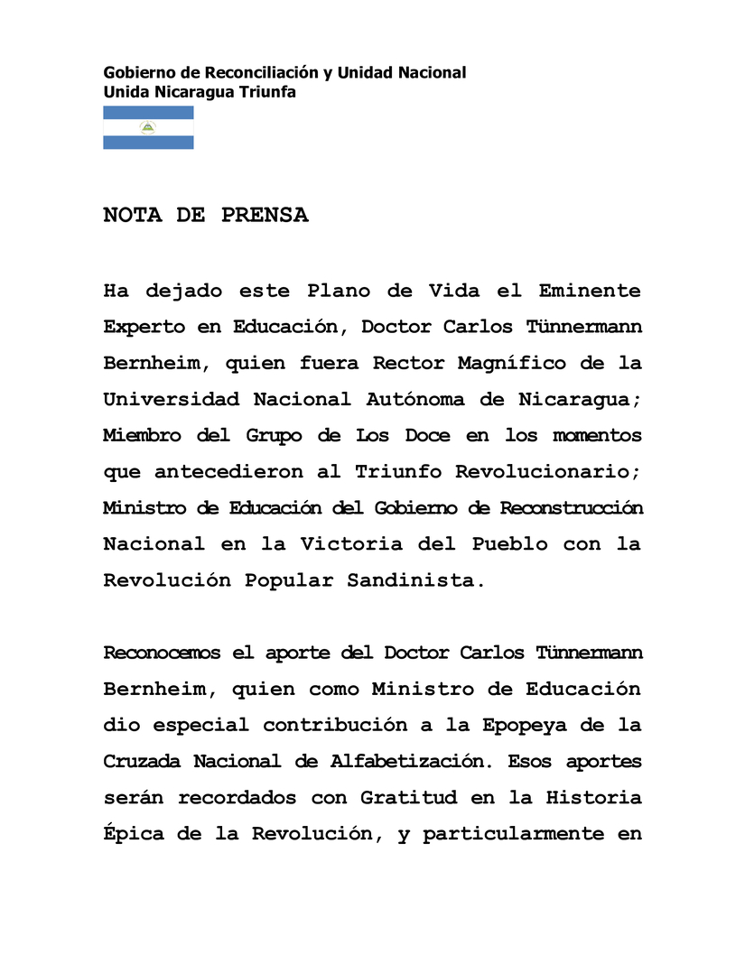 Ha dejado este Plano de Vida el Eminente Experto en Educación, Doctor Carlos Tünnermann Bernheim, quien fuera Rector Magnífico de la Universidad Nacional Autónoma de Nicaragua; Miembro del Grupo de Los Doce en los momentos que antecedieron al Triunfo Revolucionario; Ministro de Educación del Gobierno de Reconstrucción Nacional en la Victoria del Pueblo con la Revolución Popular Sandinista.