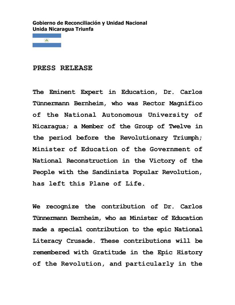 Nota de Prensa de nuestro Gobierno, sobre el Tránsito a otro Plano de Vida del Eminente Experto en Educación, Doctor Carlos Tünnermann Bernheim.