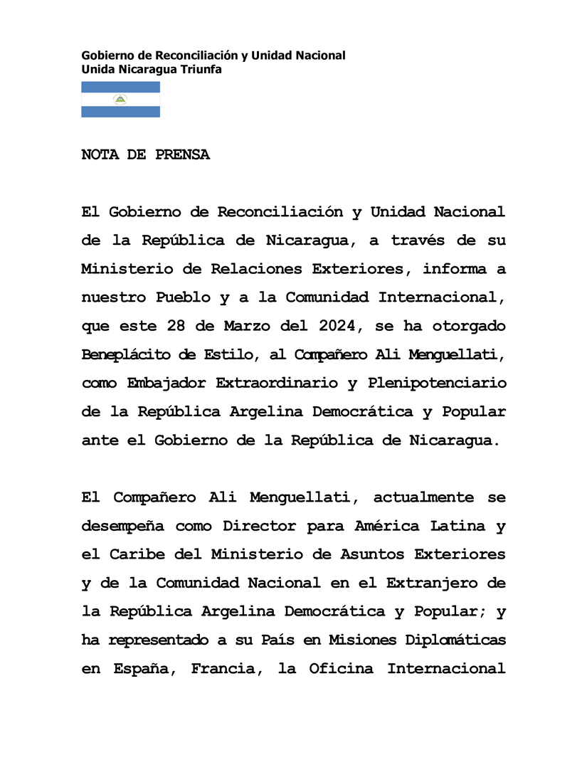 El Gobierno de Reconciliación y Unidad Nacional de la República de Nicaragua, a través de su Ministerio de Relaciones Exteriores, informa a nuestro Pueblo y a la Comunidad Internacional, que este 28 de Marzo del 2024, se ha otorgado Beneplácito de Estilo, al Compañero Ali Menguellati, como Embajador Extraordinario y Plenipotenciario de la República Argelina Democrática y Popular ante el Gobierno de la República de Nicaragua.