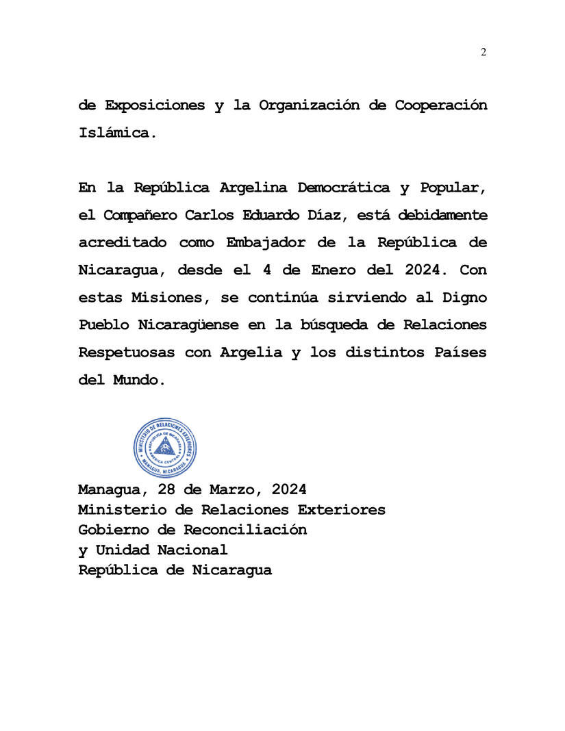 En la República Argelina Democrática y Popular, el Compañero Carlos Eduardo Díaz, está debidamente acreditado como Embajador de la República de Nicaragua, desde el 4 de Enero del 2024. Con estas Misiones, se continúa sirviendo al Digno Pueblo Nicaragüense en la búsqueda de Relaciones Respetuosas con Argelia y los distintos Países del Mundo.