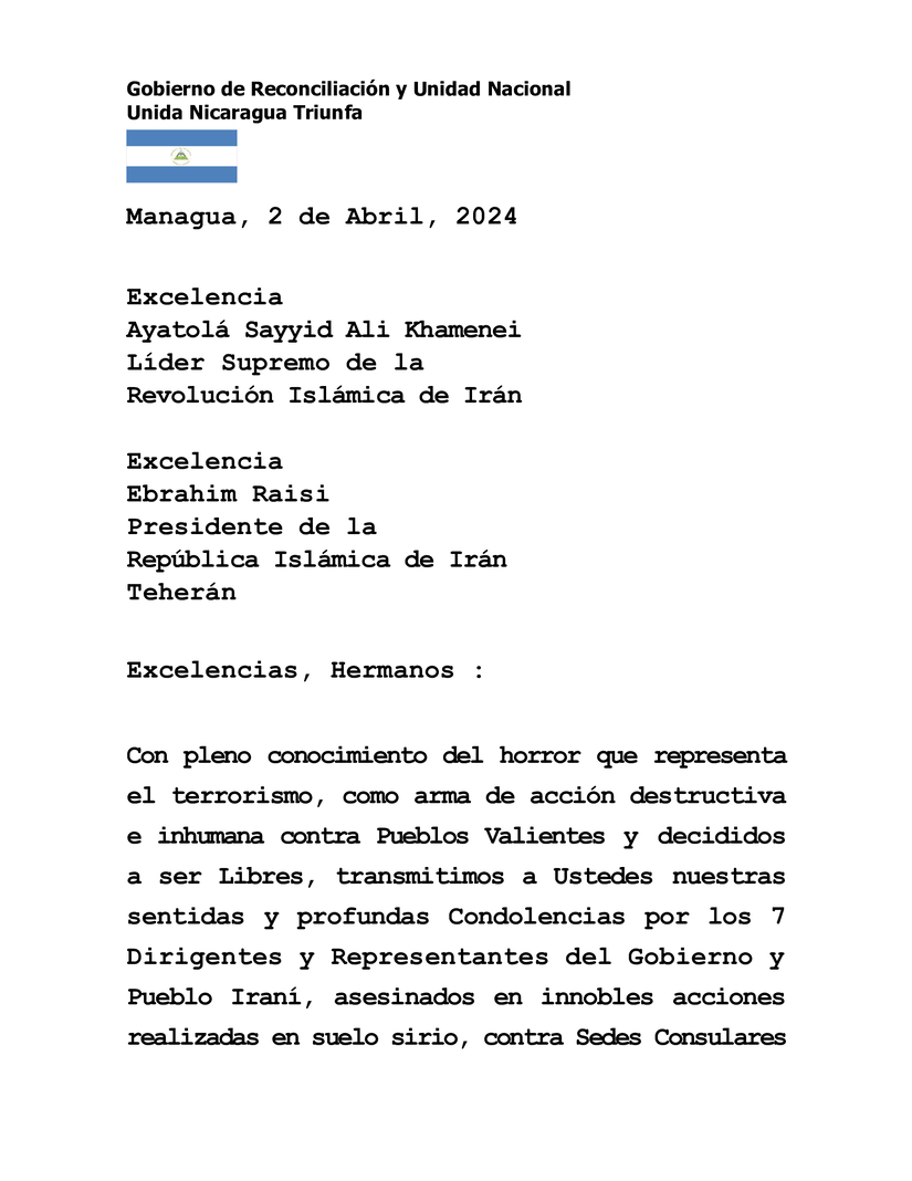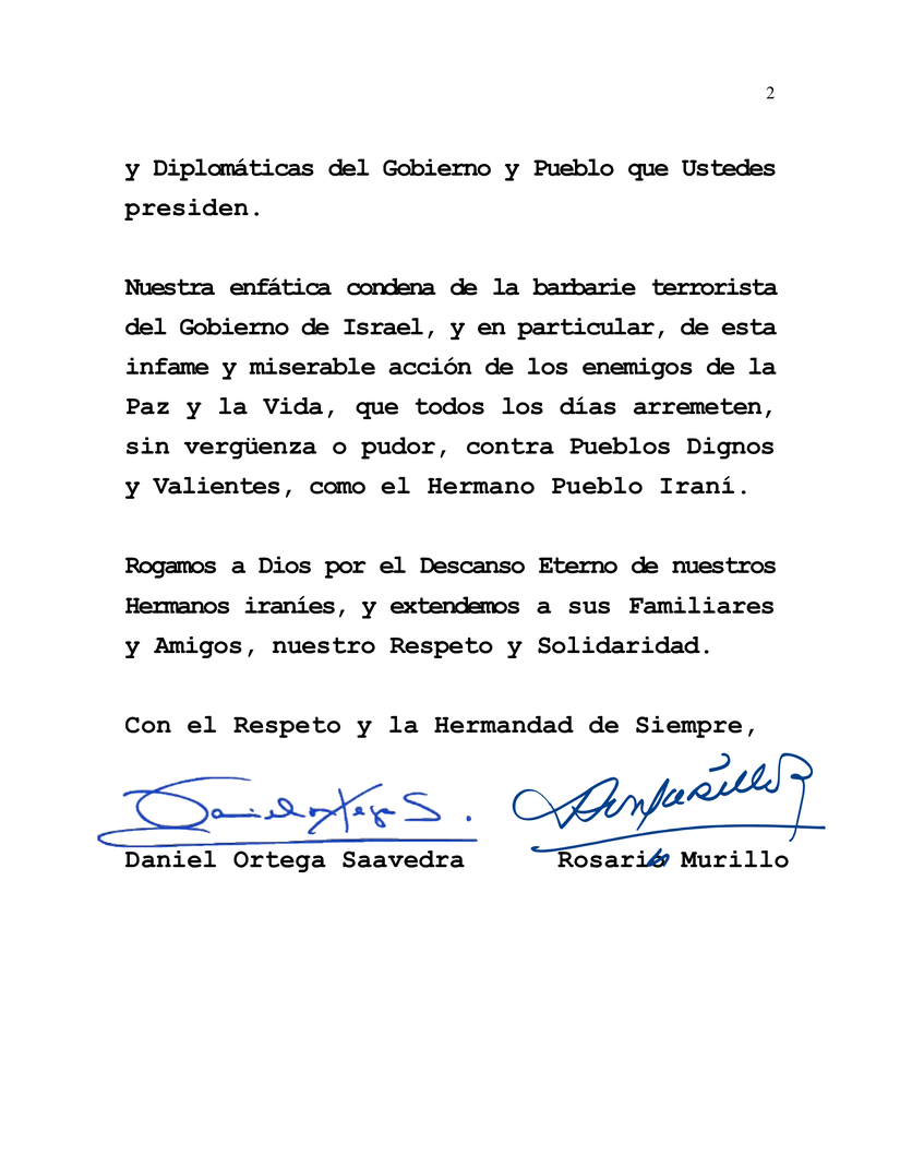 Mensaje de Condolencias del Presidente Comandante Daniel, y la Vicepresidenta Rosario Murillo, a Sus Excelencias, Hermanos Ayatollah Sayyid Ali Khamenei, Líder Supremo de la Revolución Islámica de Irán, y Ebrahim Raisi, Presidente de ese Hermano País, ante la barbarie terrorista cometida contra el Pueblo y Gobierno Iraní.