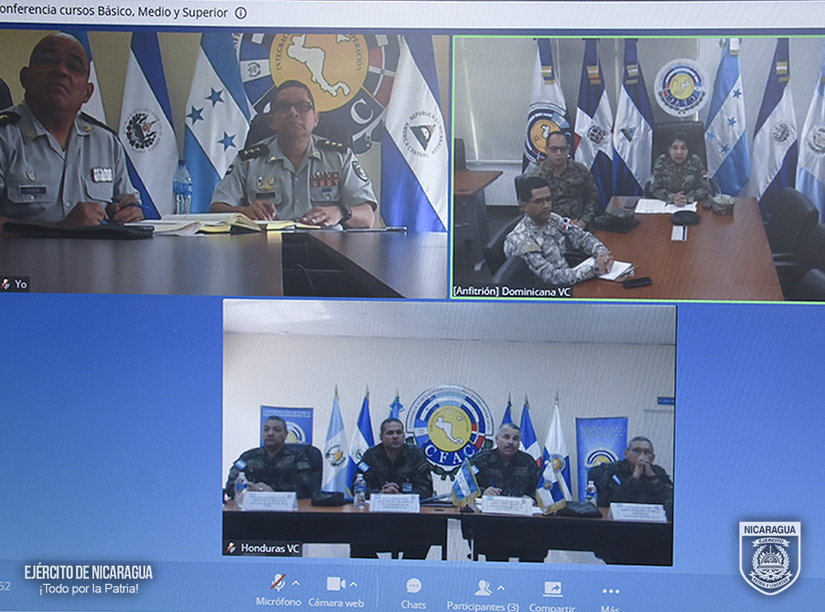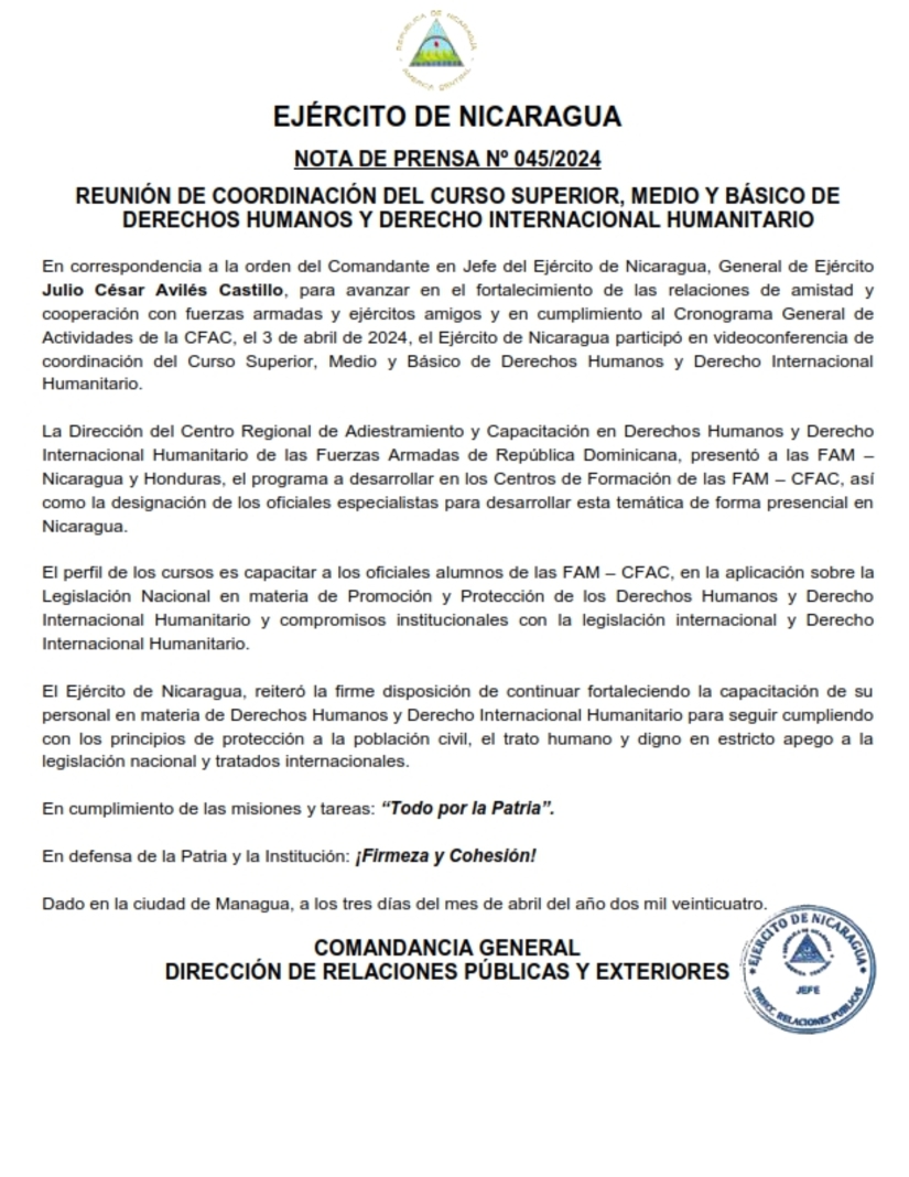 En correspondencia a la orden del Comandante en Jefe del Ejército de Nicaragua, General de Ejército Julio César Avilés Castillo, para avanzar en el fortalecimiento de las relaciones de amistad y cooperación con fuerzas armadas y ejércitos amigos y en cumplimiento al Cronograma General de Actividades de la CFAC, el 3 de abril de 2024, el Ejército de Nicaragua participó en videoconferencia de coordinación del Curso Superior, Medio y Básico de Derechos Humanos y Derecho Internacional Humanitario.