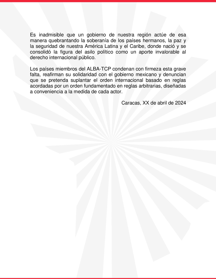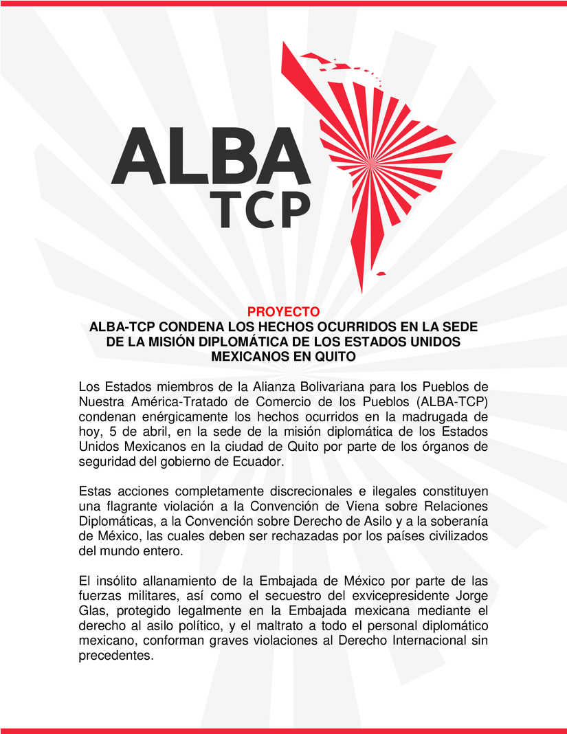 Los Estados miembros de la Alianza Bolivariana para los Pueblos de Nuestra América-Tratado de Comercio de los Pueblos (ALBA-TCP) condenan enérgicamente los hechos ocurridos en la madrugada de hoy, 5 de abril, en la sede de la misión diplomática de los Estados Unidos Mexicanos en la ciudad de Quito por parte de los órganos de seguridad del gobierno de Ecuador.