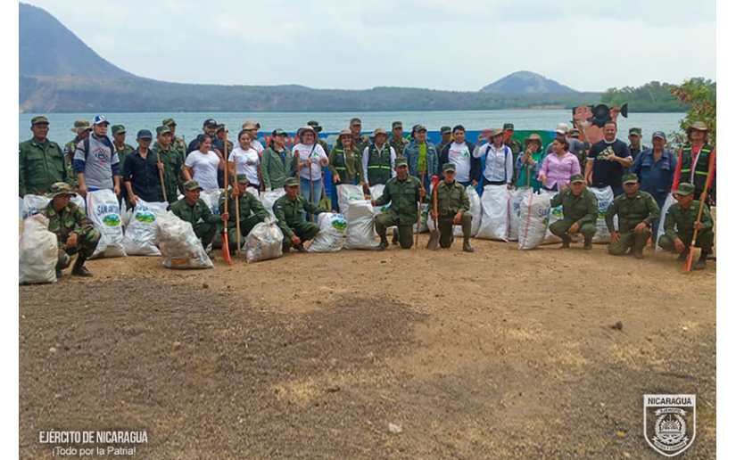 El Ejército de Nicaragua consecuente con el lema de que “somos el pueblo mismo uniformado, trabajando en su propio beneficio”, el 6 de abril de 2024, a través de la Escuela Nacional de Sargentos “Sargento Andrés Castro”, en coordinación con Ministerio del Ambiente y los Recursos Naturales (MARENA), participó en la jornada ecológica en la laguna de Xiloá, municipio de Mateare, departamento de Managua.