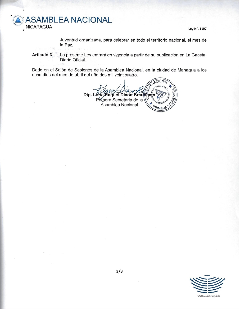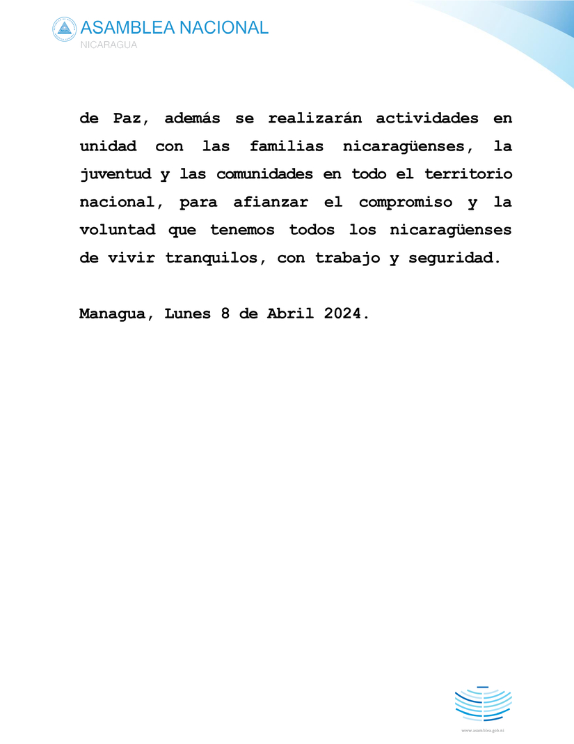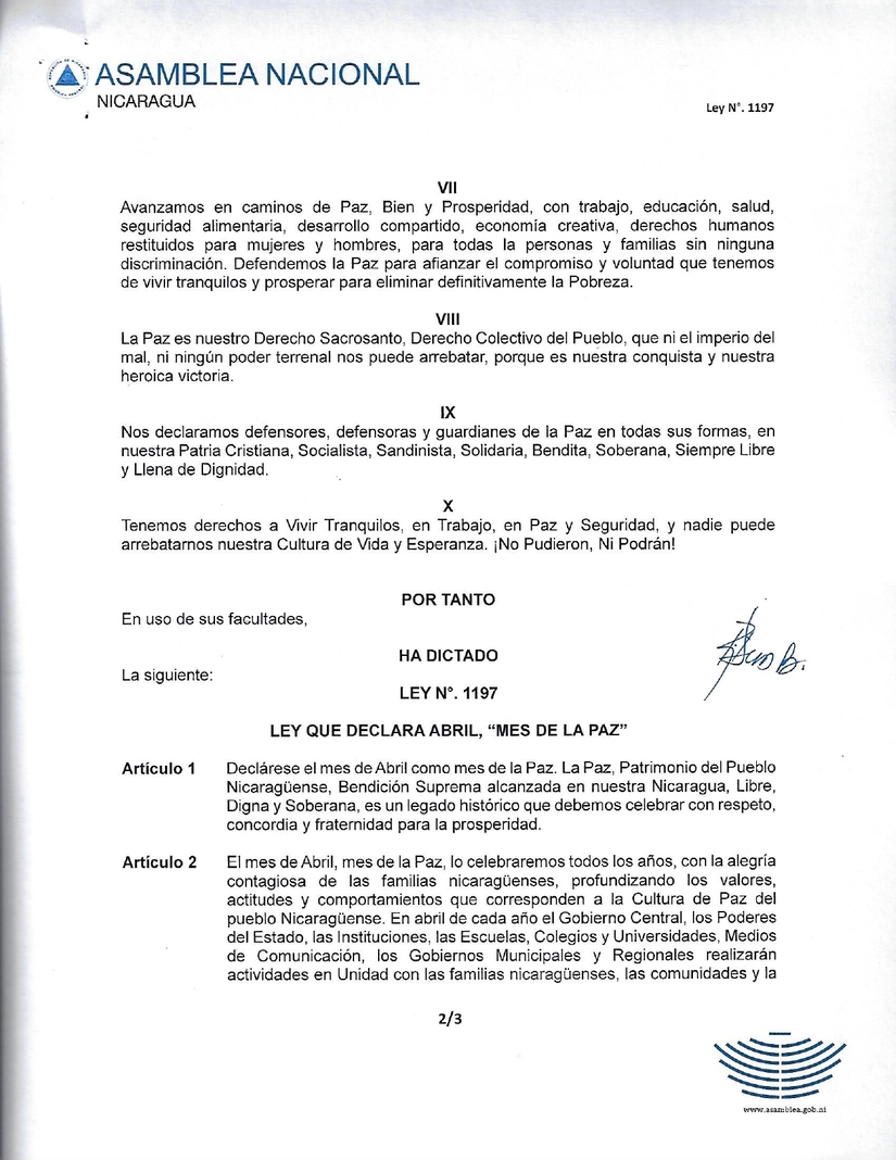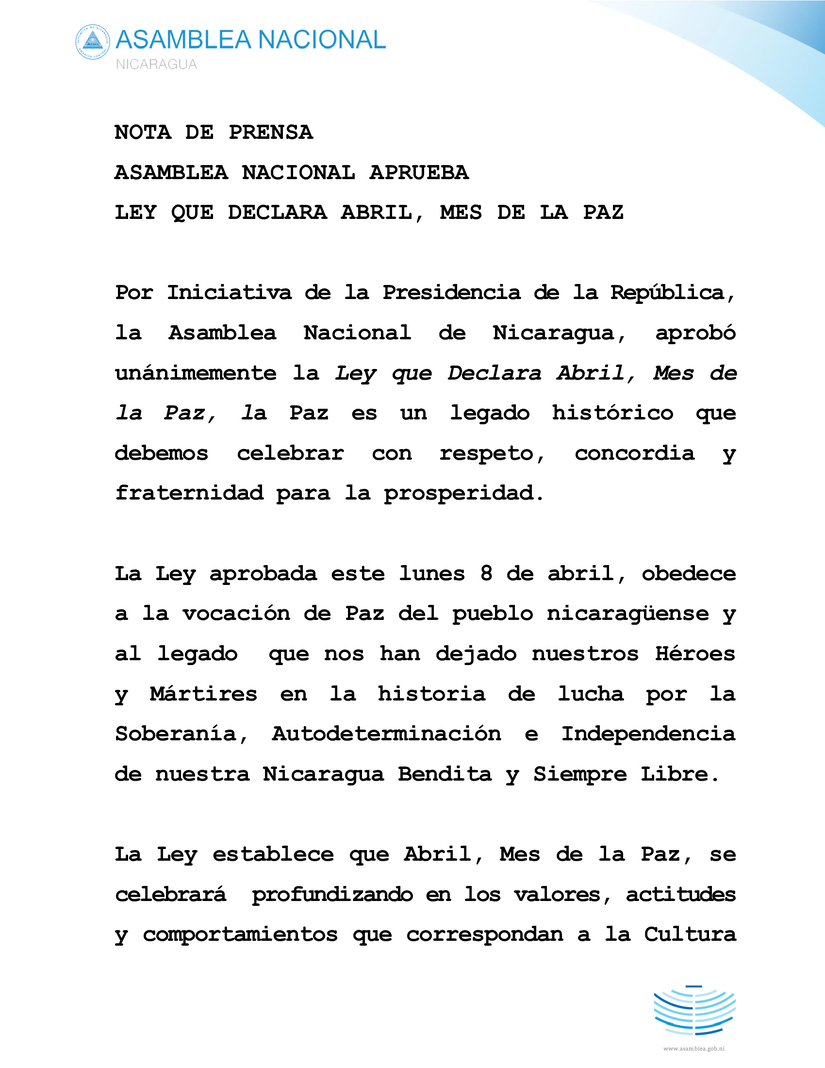 Por Iniciativa de la Presidencia de la República, la Asamblea Nacional de Nicaragua, aprobó unánimemente la Ley que Declara Abril, Mes de la Paz, la Paz es un legado histórico que debemos celebrar con respeto, concordia y fraternidad para la prosperidad.