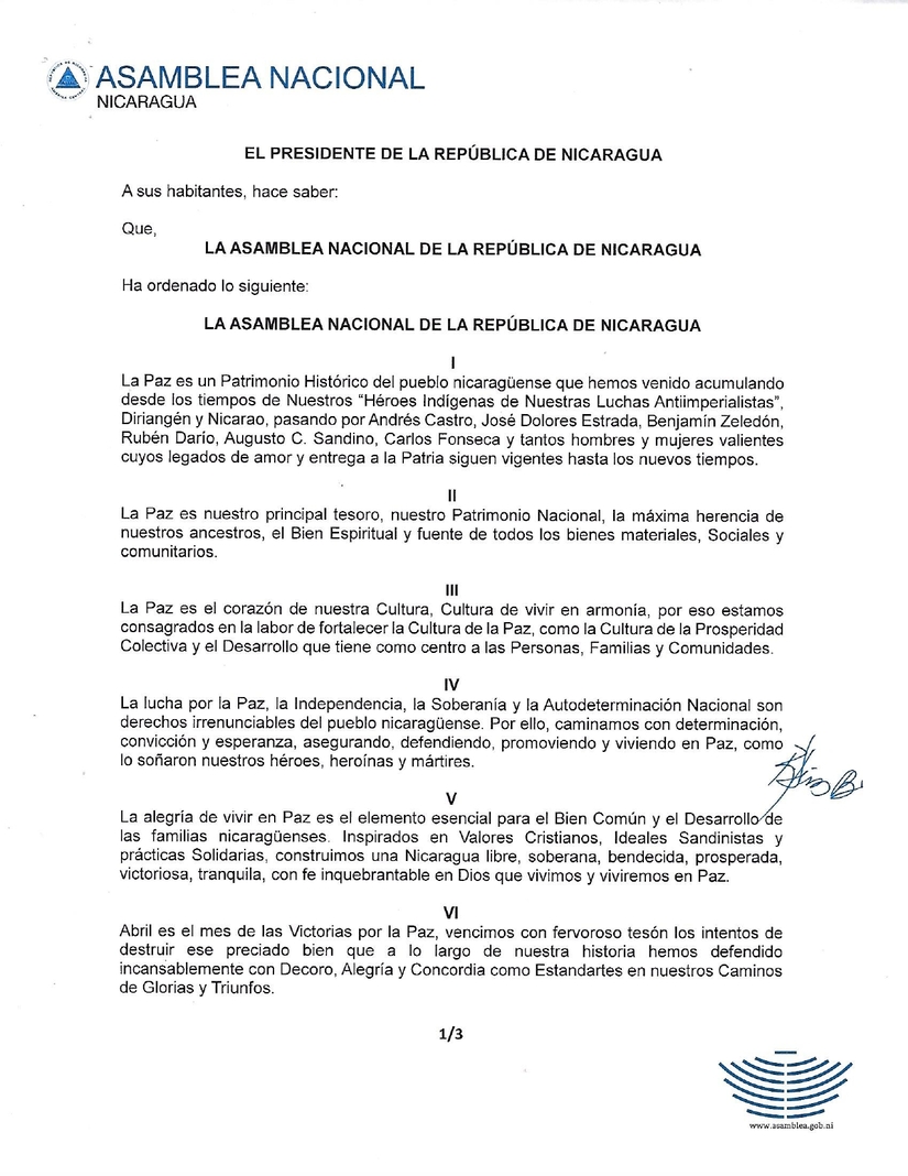 La Ley aprobada este lunes 8 de abril, obedece a la vocación de Paz del pueblo nicaragüense y al legado que nos han dejado nuestros Héroes y Mártires en la historia de lucha por la Soberanía, Autodeterminación e Independencia de nuestra Nicaragua Bendita y Siempre Libre.
