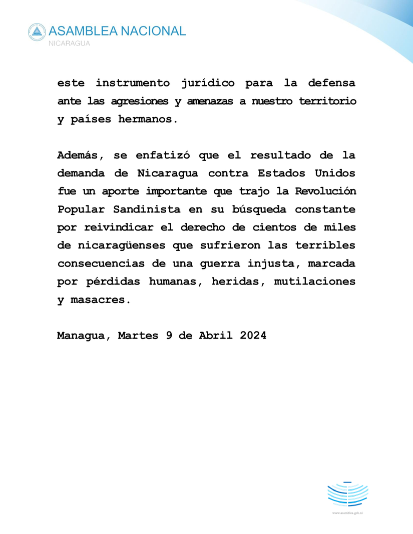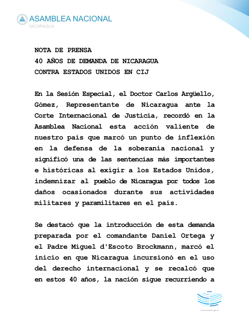 En la Sesión Especial, el Doctor Carlos Argüello, Gómez, Representante de Nicaragua ante la Corte Internacional de Justicia, recordó en la Asamblea Nacional esta acción valiente de nuestro país que marcó un punto de inflexión en la defensa de la soberanía nacional y significó una de las sentencias más importantes e históricas al exigir a los Estados Unidos, indemnizar al pueblo de Nicaragua por todos los daños ocasionados durante sus actividades militares y paramilitares en el país.