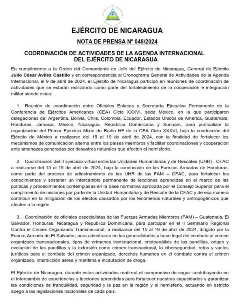 En cumplimiento a la Orden del Comandante en Jefe del Ejército de Nicaragua, General de Ejército Julio César Avilés Castillo y en correspondencia al Cronograma General de Actividades de la Agenda Internacional, el 9 de abril de 2024, el Ejército de Nicaragua participó en reuniones de coordinación de actividades que se estarán realizando como parte del fortalecimiento de la cooperación e integración militar siendo estas: