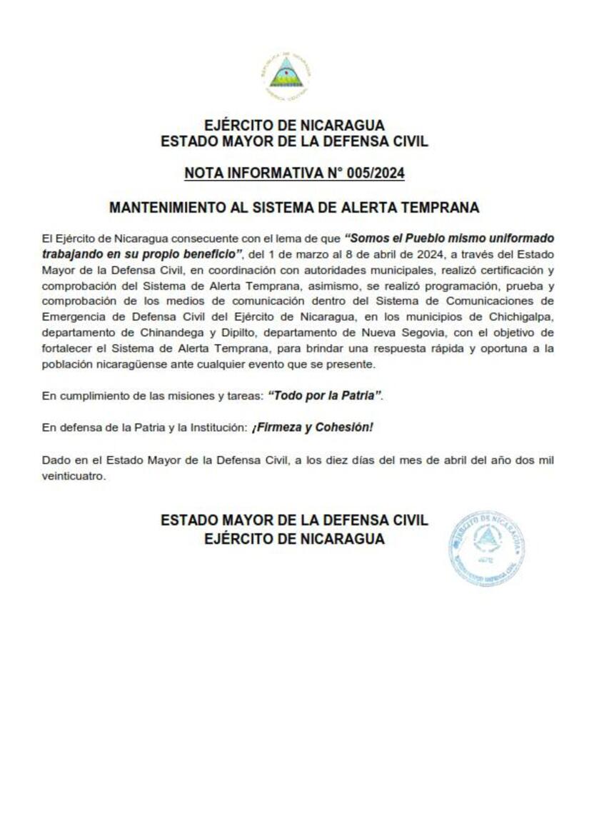El Ejército de Nicaragua consecuente con el lema de que "Somos el Pueblo mismo uniformado trabajando en su propio beneficio", del 1 de marzo al 8 de abril de 2024, a través del Estado Mayor de la Defensa Civil, en coordinación con autoridades municipales, realizó certificación y comprobación del Sistema de Alerta Temprana, asimismo, se realizó programación, prueba y comprobación de los medios de comunicación dentro del Sistema de Comunicaciones de Emergencia de Defensa Civil del Ejército de Nicaragua, en los municipios de Chichigalpa, departamento de Chinandega y Dipilto, departamento de Nueva Segovia, con el objetivo de fortalecer el Sistema de Alerta Temprana, para brindar una respuesta rápida y oportuna a la población nicaragüense ante cualquier evento que se presente.