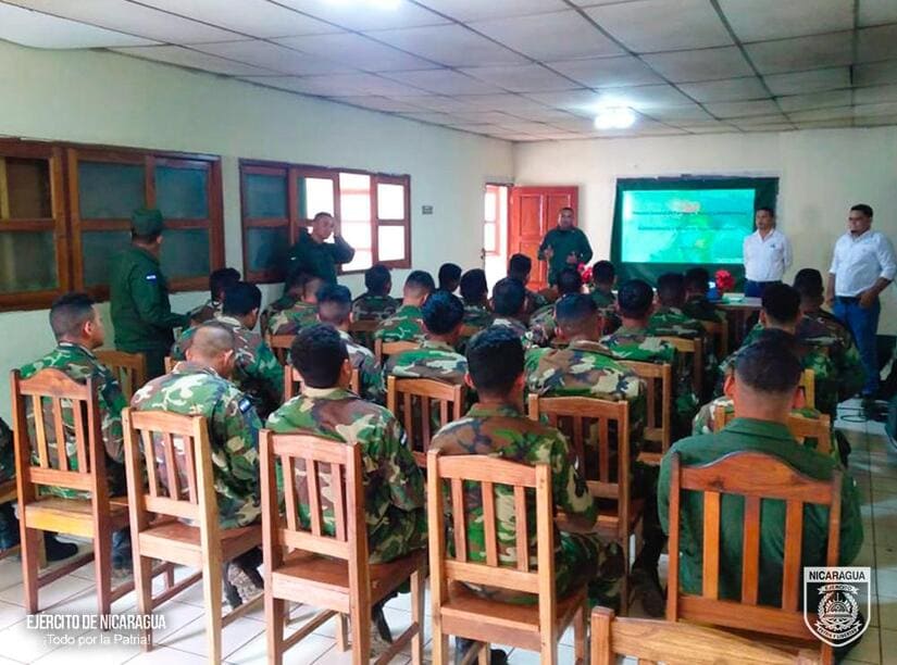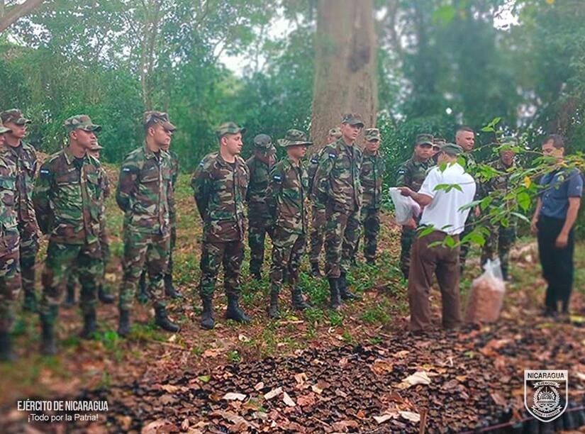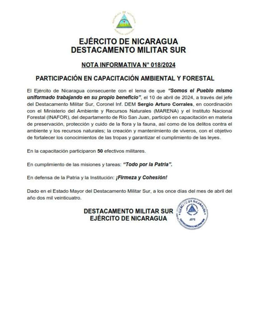 El Ejército de Nicaragua consecuente con el lema de que "Somos el Pueblo mismo uniformado trabajando en su propio beneficio", el 10 de abril de 2024, a través del jefe del Destacamento Militar Sur, Coronel Inf. DEM Sergio Arturo Corrales, en coordinación con el Ministerio del Ambiente y Recursos Naturales (MARENA) y el Instituto Nacional Forestal (INAFOR), del departamento de Rio San Juan, participó en capacitación en materia de preservación, protección y cuido de la flora y la fauna, así como de los delitos contra el ambiente y los recursos naturales; la creación y mantenimiento de viveros, con el objetivo de fortalecer los conocimientos de las tropas y garantizar el cumplimiento de las leyes.