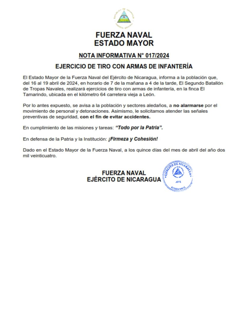 El Estado Mayor de la Fuerza Naval del Ejército de Nicaragua, informa a la población que, del 16 al 19 abril de 2024, en horario de 7 de la mañana a 4 de la tarde, El Segundo Batallón de Tropas Navales, realizará ejercicios de tiro con armas de infantería, en la finca El Tamarindo, ubicada en el kilómetro 64 carretera vieja a León.
