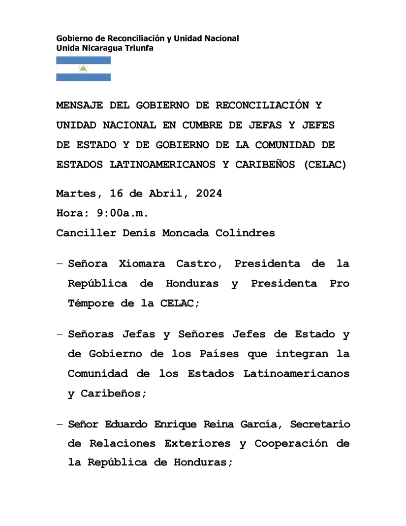 MENSAJE DEL GOBIERNO DE RECONCILIACIÓN Y UNIDAD NACIONAL EN CUMBRE DE JEFAS Y JEFES DE ESTADO Y DE GOBIERNO DE LA COMUNIDAD DE ESTADOS LATINOAMERICANOS Y CARIBEÑOS (CELAC)
