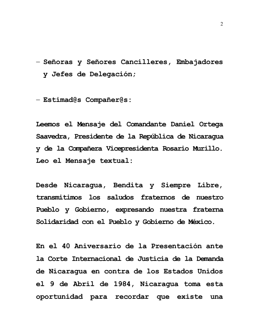 En el 40 Aniversario de la Presentación ante la Corte Internacional de Justicia de la Demanda de Nicaragua en contra de los Estados Unidos el 9 de Abril de 1984, Nicaragua toma esta oportunidad para recordar que existe una deuda histórica con el Pueblo nicaragüense que no ha sido saldada por los Estados Unidos, por las pérdidas humanas y daños materiales provocados por su agresión militar y paramilitar contra nuestro Pueblo en la década de los ochenta. Es una obligación claramente establecida en una sentencia firme, definitiva y de obligatorio cumplimiento de la máxima autoridad judicial internacional.