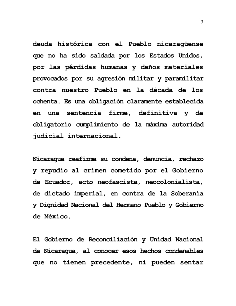 Nicaragua reafirma su condena, denuncia, rechazo y repudio al crimen cometido por el Gobierno de Ecuador, acto neofascista, neocolonialista, de dictado imperial, en contra de la Soberanía y Dignidad Nacional del Hermano Pueblo y Gobierno de México.