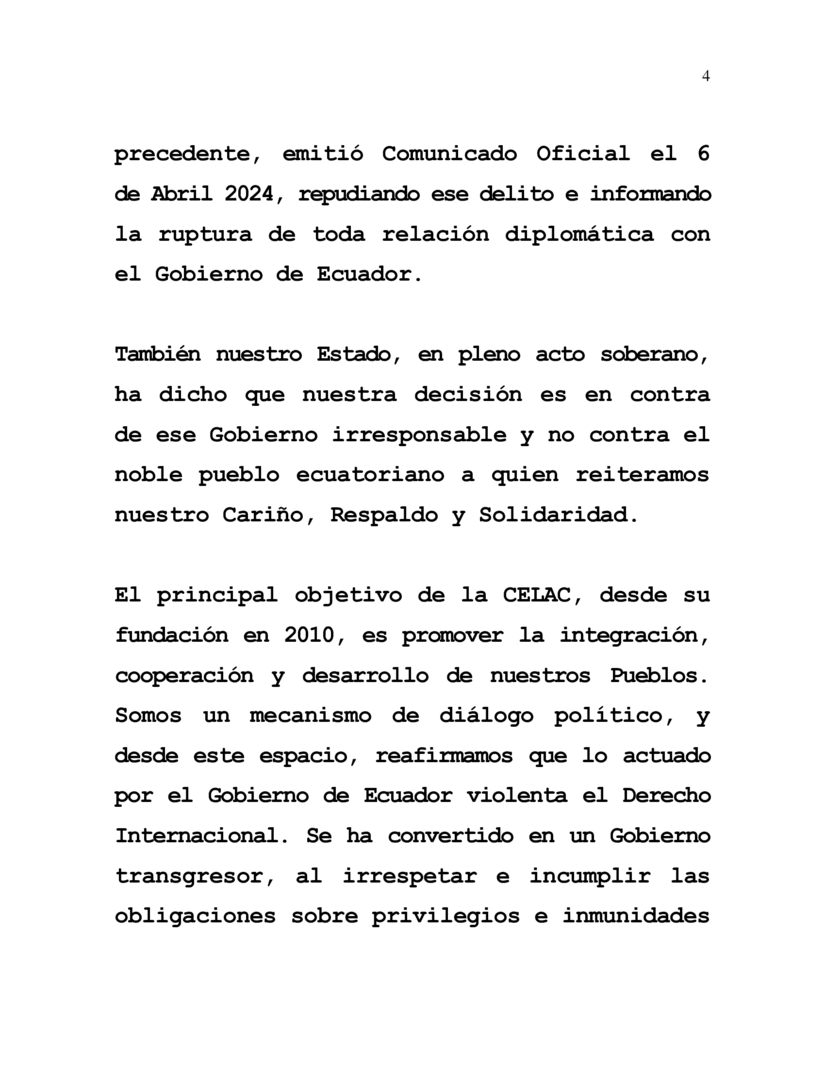 El principal objetivo de la CELAC, desde su fundación en 2010, es promover la integración, cooperación y desarrollo de nuestros Pueblos. Somos un mecanismo de diálogo político, y desde este espacio, reafirmamos que lo actuado por el Gobierno de Ecuador violenta el Derecho Internacional. Se ha convertido en un Gobierno transgresor, al irrespetar e incumplir las obligaciones sobre privilegios e inmunidades de los Diplomáticos, establecidos en la Convención de Viena, prestándose a intereses imperiales para impedir la consolidación de la CELAC.
