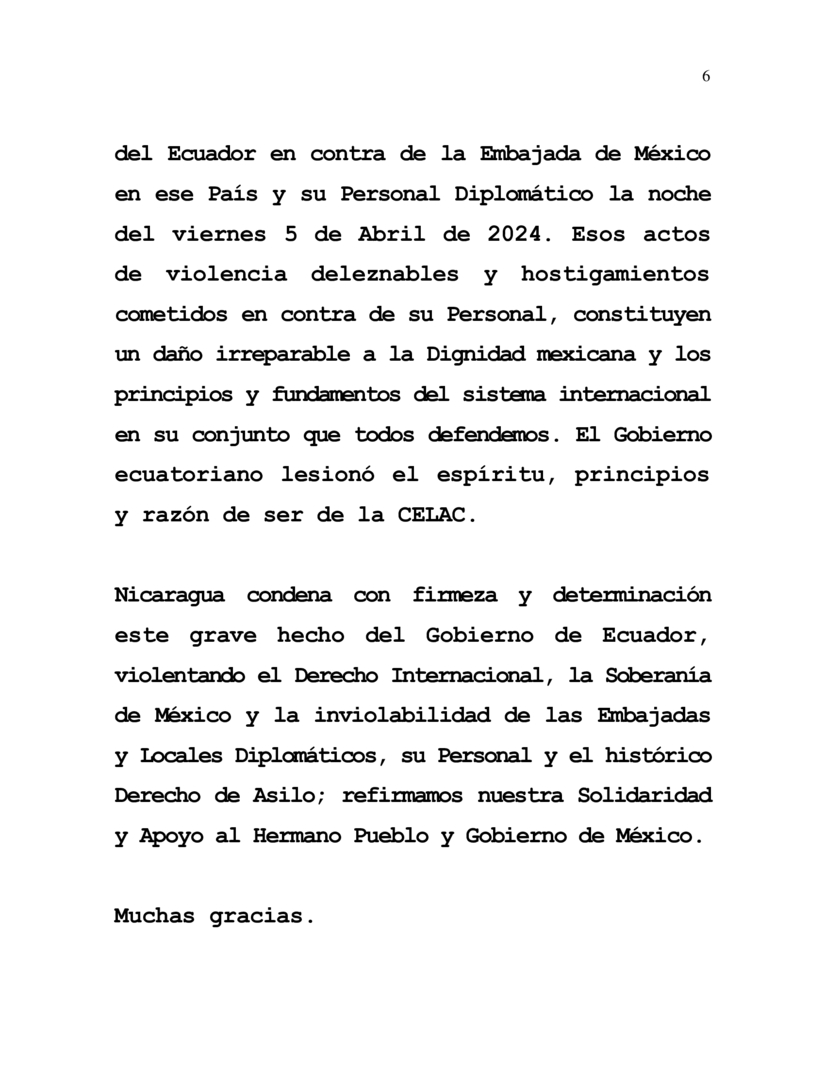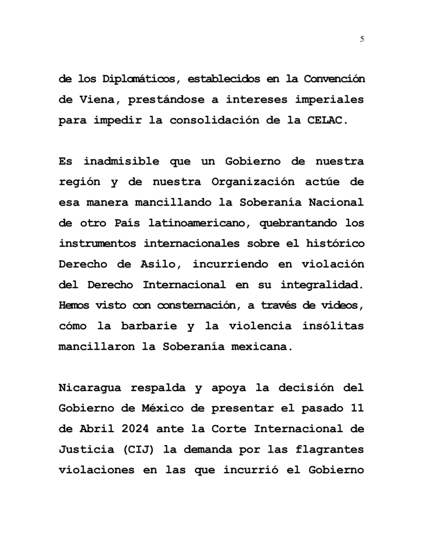 Nicaragua respalda y apoya la decisión del Gobierno de México de presentar el pasado 11 de Abril 2024 ante la Corte Internacional de Justicia (CIJ) la demanda por las flagrantes violaciones en las que incurrió el Gobierno del Ecuador en contra de la Embajada de México en ese País y su Personal Diplomático la noche del viernes 5 de Abril de 2024. Esos actos de violencia deleznables y hostigamientos cometidos en contra de su Personal, constituyen un daño irreparable a la Dignidad mexicana y los principios y fundamentos del sistema internacional en su conjunto que todos defendemos. El Gobierno ecuatoriano lesionó el espíritu, principios y razón de ser de la CELAC.