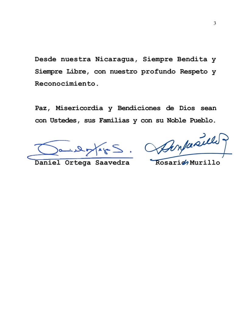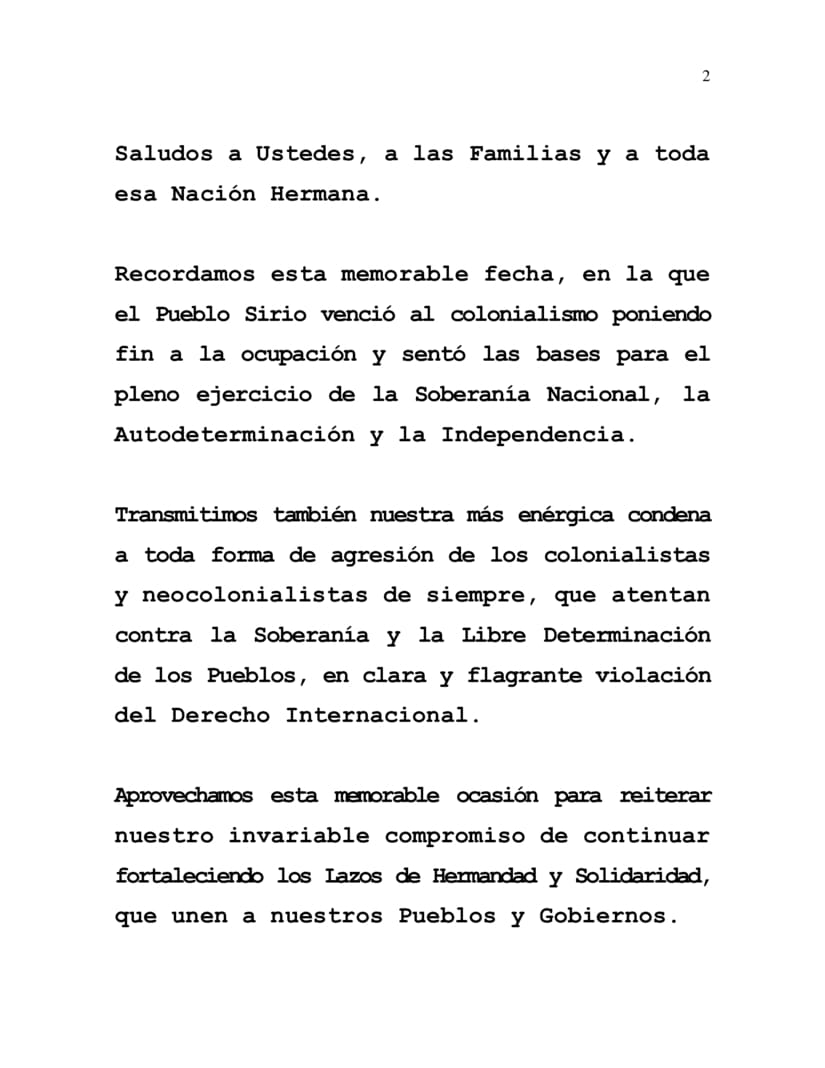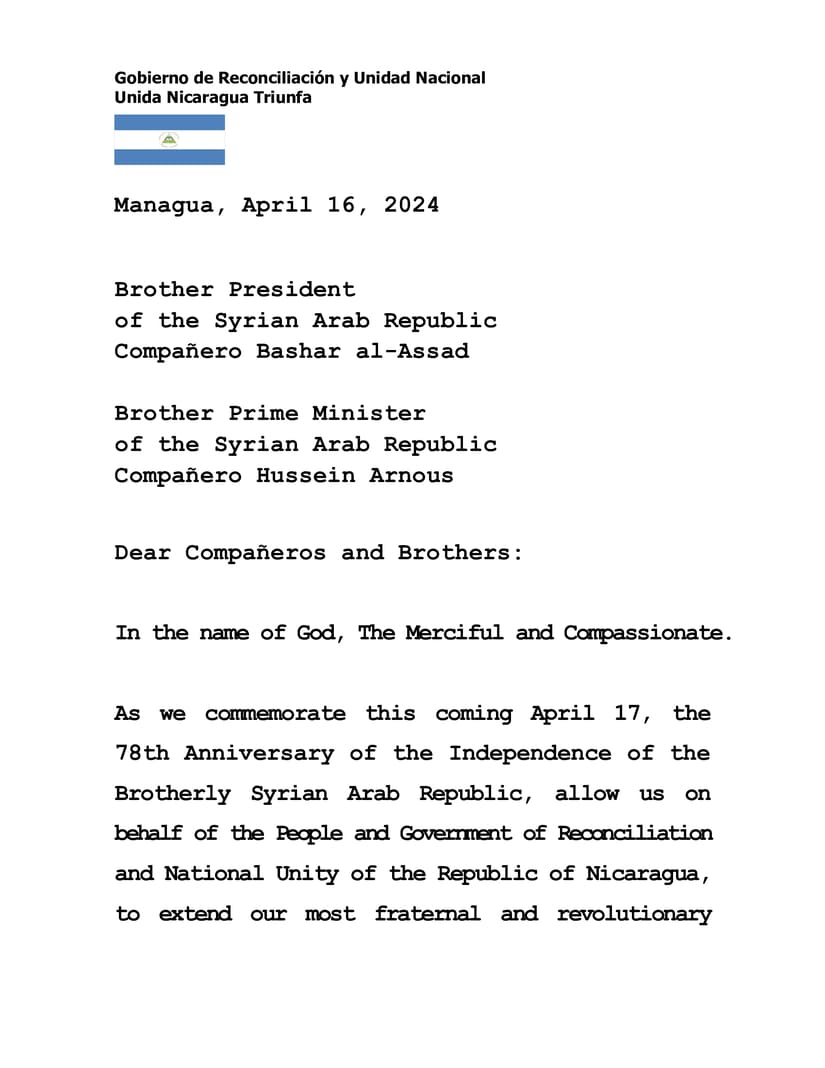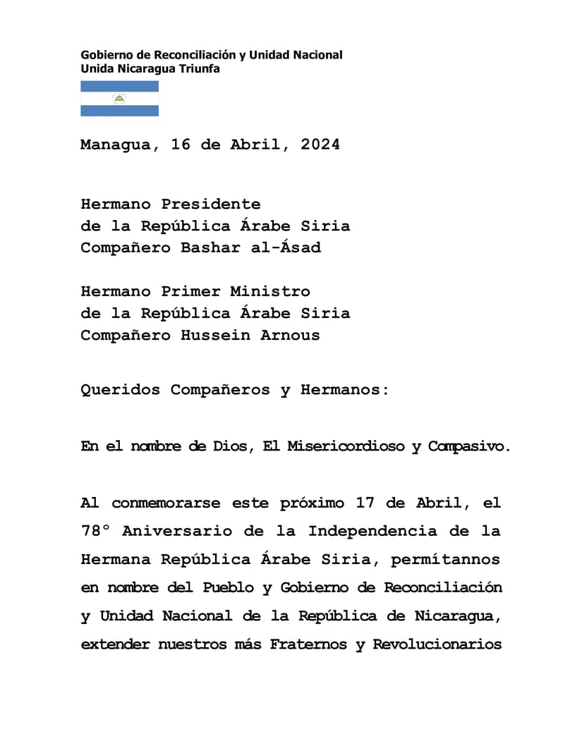 As we commemorate this coming April 17, the 78th Anniversary of the Independence of the Brotherly Syrian Arab Republic, allow us on behalf of the People and Government of Reconciliation and National Unity of the Republic of Nicaragua, to extend our most fraternal and revolutionary greetings to you, to the Families and to all that Brotherly Nation.