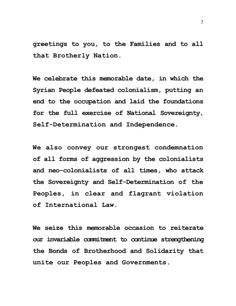 We celebrate this memorable date, in which the Syrian People defeated colonialism, putting an end to the occupation and laid the foundations for the full exercise of National Sovereignty, Self-Determination and Independence.