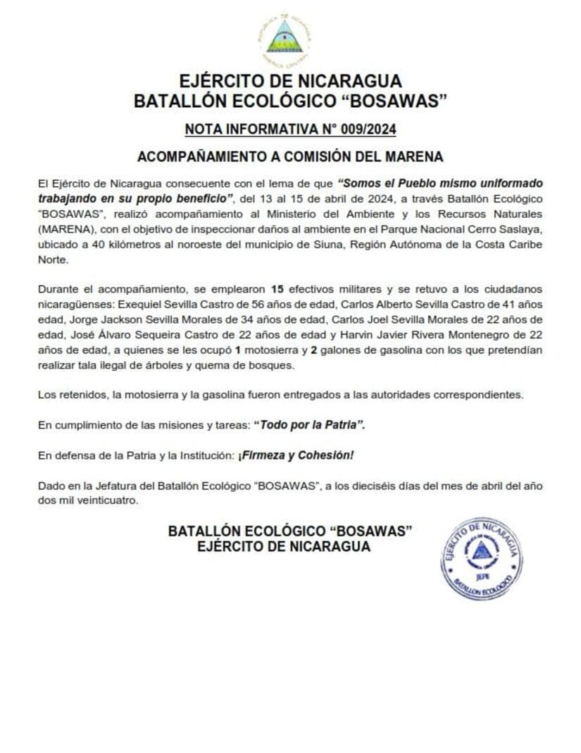 El Ejército de Nicaragua consecuente con el lema de que "Somos el Pueblo mismo uniformado trabajando en su propio beneficio", del 13 al 15 de abril de 2024, a través Batallón Ecológico "BOSAWAS", realizó acompañamiento al Ministerio del Ambiente y los Recursos Naturales (MARENA), con el objetivo de inspeccionar daños al ambiente en el Parque Nacional Cerro Saslaya, ubicado a 40 kilómetros al noroeste del municipio de Siuna, Región Autónoma de la Costa Caribe Norte.