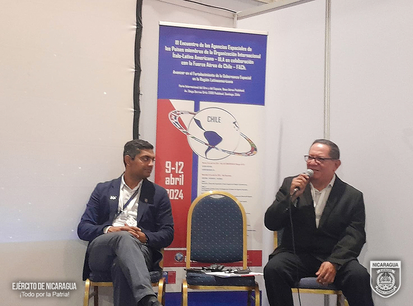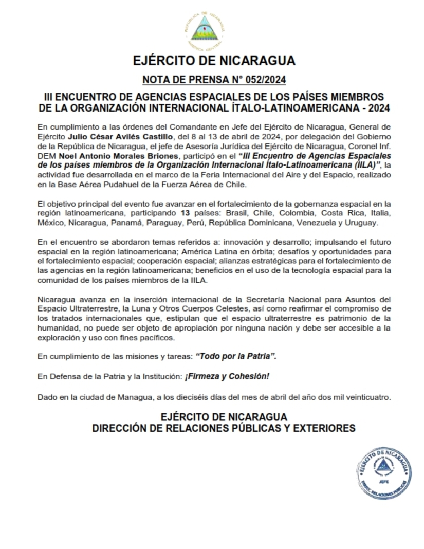 En cumplimiento a las órdenes del Comandante en Jefe del Ejército de Nicaragua, General de Ejército Julio César Avilés Castillo, del 8 al 13 de abril de 2024, por delegación del Gobierno de la República de Nicaragua, el jefe de Asesoría Jurídica del Ejército de Nicaragua, Coronel Inf. DEM Noel Antonio Morales Briones, participó en el “III Encuentro de Agencias Espaciales de los países miembros de la Organización Internacional Ítalo-Latinoamericana (IILA)”, la actividad fue desarrollada en el marco de la Feria Internacional del Aire y del Espacio, realizado en la Base Aérea Pudahuel de la Fuerza Aérea de Chile.