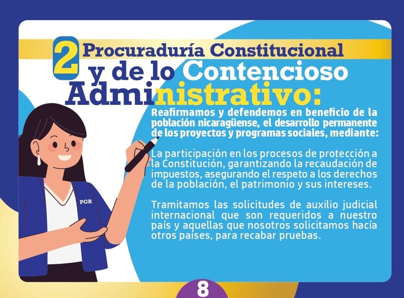 2. Procuraduría Constitucional y de lo Contencioso Administrativo: Reafirma en beneficio de la población nicaragüense, el desarrollo permanente de los proyectos y programas sociales.