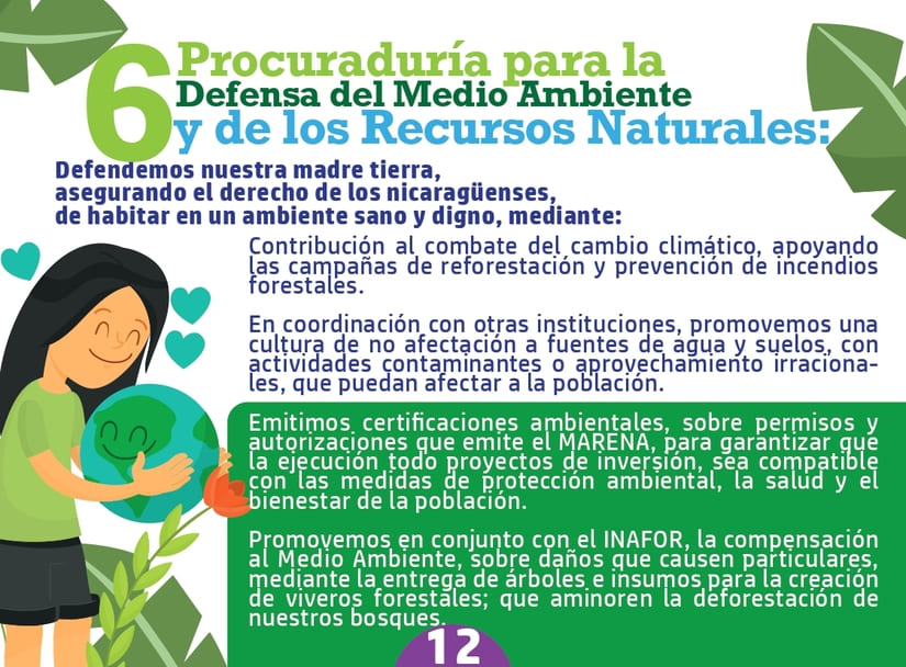 6. Procuraduría para la Defensa del Medio Ambiente y los Recursos Naturales: Mediante la Defensa de nuestra Madre Tierra, asegura el derecho de los nicaragüenses, de habitar en un ambiente sano y digno.